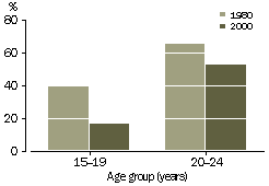 Young people Between 1980 and 2000, the employment population ratio for young people aged 15-24 years remained steady, at around 62%. However, over this time, increasing levels of participation in secondary and tertiary education led to a change in the nature of their employment. Whereas in 1980, many young people moved from school into a full-time job, by 2000 young people were taking on employment in conjunction with full or part-time study. As a result, the full-time employment rate for young people decreased from 53% to 35% over the period. The fall was much greater for 15-19 year olds (40% to 17%) than for 20-24 year olds (65% to 53%). The increase in part-time and casual employment provided greater opportunities for young people to combine full-time study with work, for some even while still at school (see Australian Social Trends 2001, Combining study and work). This is reflected in the high proportion of young people who were employed in part-time positions in 2000 (64% of 15-19 year olds and 26% of 20-24 year olds). Young men aged 15-24 years in 1980, had a higher employment rate than young women (68% compared with 56%), but by 2000 the employment rates for young men and women had converged at 61%. Many young people are still living in the family home at this age and have not yet partnered or had children (see Australian Social Trends 2000, Young adults living in the parental home). It is not until after age 25 years, that men's and women's employment rates begin to diverge as the presence of children impacts on their employment arrangements. FULL-TIME EMPLOYMENT POPULATION RATIOS OF PERSONS AGED 15-24 YEARS Source: ABS Labour Force Surveys, July 1979 to June 2000. Families with children The most common employment arrangement in families is for both parents to be working. In 2000, 63% of couple families with dependent children had both partners employed. However, in 37% of couple families with dependent children, the father was employed and the mother was not in the labour force. Most men were working full-time and their employment rate was less affected by the presence of children than women's, indicating that for most families, men were still the primary financial provider. In 2000, women with an employed partner and dependent children were generally less likely to be working than their counterparts without dependent children (63% compared with 76%). However, the likelihood that women with employed partners and dependent children would be working increased with age, reflecting the growing independence of children as they get older. While only 33% of young women with dependent children and employed partners were working, the proportion increased to 73% for women aged 45-64 years in this family situation. These patterns contrasted markedly with those of women in couple families with an employed partner but without dependent children. These women were more likely to be working and were more likely to be working full-time, particularly those aged 15-44 years, who had full-time employment rates of 65% for the 15-24 years age group and 71% for the 25-44 years age group. For lone parents, opportunities to enter the workforce are often constrained by child care responsibilities, particularly for those with children who are not yet at school. In 2000, 51% of lone parents were employed. As the age of their youngest child increased, both lone mothers and partnered mothers were more likely to be employed and differences in the employment rates of the two groups decreased. EMPLOYMENT RATIOS OF FEMALES WITH EMPLOYED PARTNERS, 2000