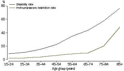 Of particular concern are those disabilities which result in a specific restriction and affect core activities, such as mobility or self care, or which affect schooling or employment activities. As with disability, the proportion of people with a specific restriction also increased with age, rising from 7% for people aged 15-34 years to 43% for those aged 65 years and over.
