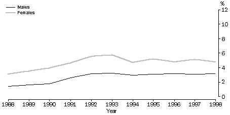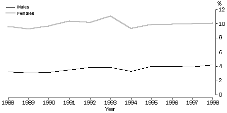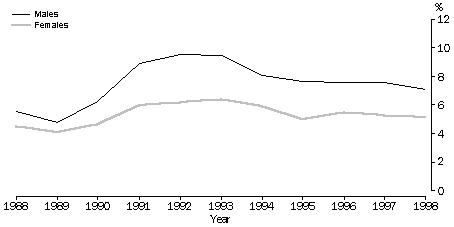 (b) Persons in part-time jobs who were actively looking for extra hours, at September 1998. (c) Persons who wanted to work and were available to start work within four weeks but were not actively looking for work, at September 1998. (d) This column identifies those among the marginally attached who, from their main reason for not looking for work are classified as being discouraged jobseekers. Source: Unpublished data, Survey of Job Search Experience of Unemployed Persons, July 1998; Survey of Underemployed Workers, September 1998 and Survey of Persons Not in the Labour Force, September 1998. Barriers to finding work among the unemployed and underemployed For people in the labour force wanting work (the unemployed and under-employed), the limited supply of jobs is a key reason for not being able to find work. However, the reasons people wanting work give as their main difficulty in getting a job differ according to their individual circumstances. Barriers to finding paid work can include factors related to personal capabilities, ill health, and to various forms of discrimination. Of those unemployed, men were more likely to attribute their difficulty to the state of the job market - no vacancies in their line of work or no vacancies at all (23% compared to 16%) - whereas women were more likely to attribute their difficulty to their own lack of skills (26% compared to 20%). Both men and women were equally likely to see the level of competition as their main difficulty in finding a job - too many applicants for the available jobs (both 14%). Underemployed men and women were less likely than unemployed people to report personal capabilities as their main reason for not finding work. However, this could be expected, as these people were already in employment. PROPORTIONS OF MEN AND WOMEN AGED 15-64 WANTING WORK, 1988 TO 1998 Unemployed Marginally attached Underemployed Source: Labour Force Surveys (microfiche) and Persons Not in the Labour Force, September 1988 (cat. no. 6220.0). Discouraged jobseekers Some of the people marginally attached to the labour force (70,600 women and 26,400 men) did not actively look for work, because they believed they would not find a job. Men who were discouraged jobseekers (a greater proportion of whom were aged 55-64 years - 51% compared to 30% of women) were more likely to be discouraged because of perceived job shortages or because they felt they would be discriminated against because of their age. Responses to changing economic conditions Changes in the proportions of people unemployed (or, as more commonly described, changes in unemployment rates) and in the numbers of discouraged jobseekers (for both measures see Australian Social Trends 1999, Work - National summary tables), provide sensitive indicators of the health of the economy. As graphically illustrated by the changes that occurred during the last economic recession, during the early 1990s, unemployment levels among men were particularly sensitive to changing economic conditions. In contrast, the changes in the proportions of people who were marginally attached to the labour force and underemployed (the groups in which women predominate) were comparatively small. Nevertheless, as indicated by the greater upward shift in the proportions of women classified as being marginally attached to the labour force during the recession, it appears that women who want work have a greater tendency than men to move out of the labour force during periods when the over-supply of labour is greatest. The different movements in proportions of men and women identified as being unemployed and marginally attached to the labour force during the last recession may, in part, reflect decisions within couple families as to who should take the most active steps in seeking to provide for the family. Endnotes 1 Australian Bureau of Statistics 1999, Labour Force Australia, April 1999, cat. no. 6203.0, ABS, Canberra.