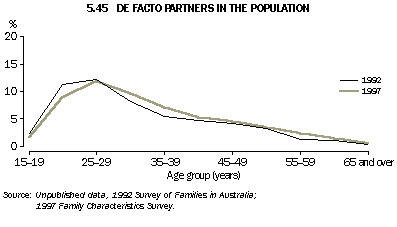 De facto marriages Between 1992 and 1997, the number of people in de facto marriages rose by 6.4% from 710,800 to 756,500 people. In 1997, de facto partners represented 9.1% of all persons living in couple relationships (up from 8.5% in 1992) and 5.3% of persons aged 15 years and over (the same as in 1992). The proportion in de facto marriages peaked among people aged 25-29. It was also high in the adjacent age groups and then fell away to lower levels with increasing age (graph 5.45). Of all de facto partners in 1997, 56% were aged 20-34. De facto partnering has arisen as an alternative living arrangement prior to, or instead of marriage, and following separation, divorce or widowhood. Some couple relationships, such as that between a boyfriend and girlfriend who live together but do not consider their relationship to be marriage-like, are classified as de facto. Of all people in de facto relationships in 1997, 69% had never been in a registered marriage, and 29% were either separated or divorced. The likelihood of being never married was higher among those aged under 35, counterbalanced by higher proportions of separated and divorced de facto partners aged 35 and over (graph 5.46). In 1997, 46% of de facto couples had children, compared with 39% in 1992. Divorces For most of the 20th century there was a slow but steady rise in the numbers of divorces granted each year, increasing from annual averages of 0.1 divorces per 1,000 population between 1901 and 1910 to 0.8 per 1,000 between 1961 and 1970. However, the most important factor involved in the higher divorce rates in the latter quarter of the century was the introduction of the Family Law Act 1975 which came into operation on 5 January 1976. This legislation allows only one ground for divorce: irretrievable breakdown of the marriage, measured as the separation of the spouses for at least one year. Following the implementation of this law, there was a large increase in the divorce rate in 1976. The rate then declined until 1979 as the backlog of applications was cleared. Since then the crude divorce rate has fluctuated between 2.4 and 2.9 divorces per 1,000 population (graph 5.47). The pattern of divorces per 1,000 married couples is very similar; in 2000 there were 12.0 divorces per 1,000 married men or women. Table 5.48 brings together summary measures of divorces granted in Census years between 1901 and 1986, and individual years between 1990 and 2000.