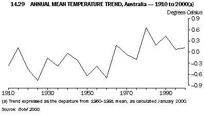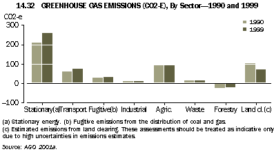 The Earth's climate has gone through many cycles that have caused significant fluctuations in the temperature of the Earth's surface. In the context of geological time, current global temperatures are in the middle range of those experienced by the Earth (ABS 2001). When viewed over a shorter period, however, a different picture can be seen (graph 14.29). There is widespread national and international concern that it is the activities of people which have caused temperatures to increase worldwide (Watson 1999). Carbon dioxide and other 'greenhouse gases' are released into the atmosphere from the use of fossil fuels, and stored carbon has also been released through the clearing of vegetation. It is thought that increasing the concentration of greenhouse gases in the atmosphere increases its ability to absorb heat energy (UNEP & UNFCCC 1999). This has been termed the 'greenhouse effect' or 'enhanced greenhouse effect'. Projections indicate that annual average temperatures in Australia could be 0.4 to 2.0 degrees higher by 2030 and 1.0 to 6.0 degrees higher by 2070 (CSIRO 2001a). The United Nations Framework Convention on Climate Change (The Framework Convention) established the first international treaty dealing with climate change and laid the basis for global action to "protect the climate system for present and future generations" (UNEP & UNFCCC 1999). Governments recognised the need for legally binding commitments to greenhouse gas emission limitations and reductions which were subsequently reflected in policy terms in the Kyoto Protocol. Australia negotiated to restrict its emissions increases to 8% above 1990 levels in the budget period 2008 to 2012. At the recent sixth Conference of Parties in Bonn, Germany, the international community (excluding the United States) agreed to reduce global greenhouse gas emissions by an average of around 2% by 2008-2012 (Pannell 2001). According to the National Greenhouse Gas Inventory (NGGI), Australia's total emissions of greenhouse gases increased by 67.9 megatonnes of carbon dioxide equivalents (17.4%) between 1990 and 1999 (graph 14.30 and table 14.31). The rate of growth reached peaks of 3.6% in 1995 (mainly due to increases in emissions from the Manufacturing, Electricity generation and Transport sectors) and of 4.5% in 1998 (largely due to an increase in Electricity generation emissions) (AGO 2001a). While total carbon dioxide equivalent emissions increased by 17.4% between 1990 and 1999, the emissions of individual greenhouse gases that make up this total varied significantly. Emissions of carbon dioxide (CO2) increased by 25.5%, methane (CH4) emissions by 1.0% and those of nitrous oxide (N20) by 30.8% (table 14.31). Perfluorocarbons (PFC) and sulfur hexafluoride (SF6) were the only greenhouse gases to record a decrease in emissions over the period (79.2% lower in 1999 than in 1990). As a result of these changes, carbon dioxide increased its share of total emissions from about 64% to 68%. 14.31 GREENHOUSE GAS EMISSIONS, By Gas - 1990 and 1999
