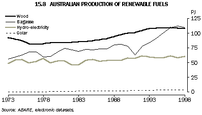 Although production of renewable fuels increased by 18% between 1990-91 and 1998-99, their share of total energy production fell from 2.6% to 2.3% over this period. The production of renewable fuels is shown by type of fuel in graph 15.8. (It should be noted that there is a limit to the possible increase in bagasse's share of renewable energy, which is related to the production of sugar canes.)