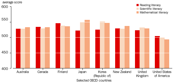 The OECD’s 2000 Programme for International Student Assessment, which measured the reading, mathematical and scientific literacy of 15 year olds, confirmed the findings of earlier studies that Australian secondary students perform relatively well in standardised international assessments. Only Finland achieved substantially higher in reading literacy, only Japan in mathematical literacy and only Japan and the Republic of Korea in scientific literacy. Australia’s performance was generally comparable with that of New Zealand, Canada and the United Kingdom; all were over the OECD average. Despite our comparatively good results internationally, there was some variation in achievement for Australian students with different characteristics and backgrounds (see Australian Social Trends 2002, Literacy and numeracy among school students).