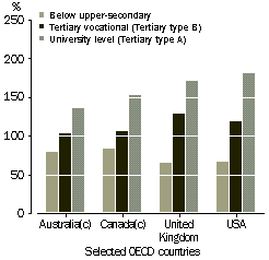 Differences in the average earnings of people with different levels of educational attainment tend to be smaller in Australia than in other OECD countries. For example, the difference between the earnings of those 15-64 year olds in Australia who had not completed the upper secondary level and those who had completed the university level was 57 percentage points, while the comparable figure for the United States of America was 113 percentage points.