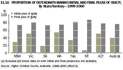 Table 11.14 summarises the flow of defendants through the Higher Courts during 1999-2000. The workload of the criminal courts can be shown by the number of defendants involved in cases started before 1999-2000 and which are still being processed (pending at start) and by the number of defendants with cases started in the Higher Courts during 1999-2000 (initiated). Excluding defendants in Queensland (for which there are only partial data - see footnote (b) in table 11.14), there were 7,649 defendants pending at the start of 1999-2000 and 11,007 defendants initiated during 1999-2000, giving a total workload of 18,656 defendants who had criminal cases active at some time during 1999-2000. Of this total workload, 11,511 defendants (62%) were finalised in the Higher Courts during 1999-2000. The number of defendants initiated in Queensland during 1999-2000 was 5,985; the number finalised was 7,379.
