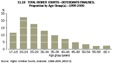 Graph 11.18 shows the proportion of defendants by age group during 1999-2000. Just over half (52%) of the defendants finalised during 1999-2000 were aged between 17 and 29 years, with more than one in five defendants (22%) falling in the 20-24 year age group. The median ages of male and female defendants were almost the same at 29 and 28 years respectively. The majority (87%) of finalised defendants were male.