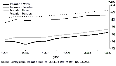 A Tasmanian male born in 2002 could expect to live 76.5 years and a female could expect to live 81.3 years. By comparison, in 1900, life expectancy at birth was 54.2 years for males and 55.6 years for females.