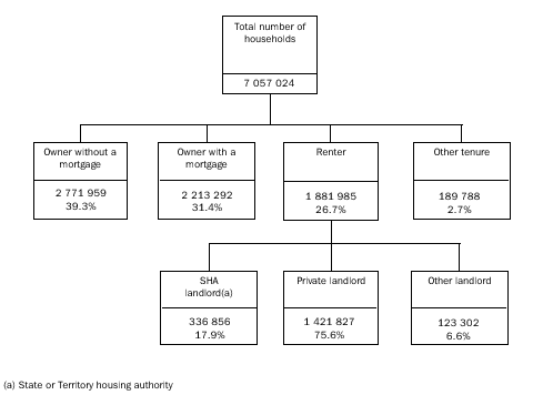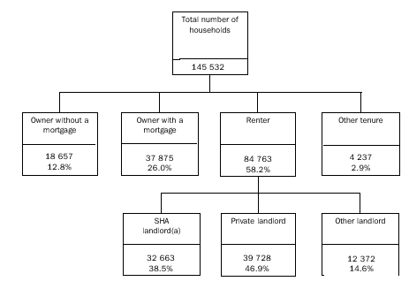 For example, in a household containing a lone parent with a non-dependent child, the person with the highest tenure will become the reference person. If the non-dependent child is an owner with a mortgage and the lone parent lives in the dwelling rent free, the non-dependent child will become the reference person. If both individuals have the same tenure, the one with the higher income will be the reference person. However, if both individuals have the same income, the reference person is the elder. Rent A return or payment made periodically by a tenant to an owner or landlord in return for lodgement. Rent/buy (or shared equity) scheme The household is both purchasing some equity in the dwelling, and paying rent for the remainder. Rent free A household where no money is exchanged for lodgement but the household is not an owner of the dwelling. Renter A household where money is exchanged to another person or organisation in return for lodging. In this publication, renters are further classified into one of three broad types according to whom rent is paid: