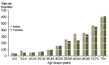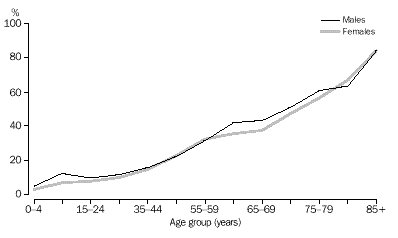 Sex and age The rate of disability increased with age, from 4% for children aged 0-4 years to 84% for those aged 85 and over. While the proportion of males and females with a disability was similar (around 19%), it varied across age groups. Males had similar or higher rates across all age groups except for those aged 80-84 years. In particular, disability rates for males were markedly higher for those who were young (0-14 years) or approaching older age (60-79 years). The greater proportion of females in the older age groups, where disability rates are higher, affects the overall disability rate for females. If both sexes were evenly distributed across age groups, males would have a disability rate of 20%, compared with 18% for females. Disability rates by age and sex, 1998 When the disability population is confined to people with a specific restriction, rates are again similar for males and females (17%). Differences between males and females are less marked across most age groups. Of the 1.1 million people with a profound or severe core activity restriction, 56% were female. Among older people, the rates of severe and profound disability were markedly greater for females. Profound/severe core activity restriction rate(a), 1998 (a) Standardised to March 1998 Australian population distribution Comparison over time There has been a steady rise in the underlying disability rate since the first disability survey in 1981. After adjusting for changes between surveys and in the age distribution of the population, the rate has increased from 15% in 1981 to 19% in 1998. This is underpinned by growth in the proportion with specific restriction from 10% to 16% in the same period. The greater part of the increase between 1993 and 1998 is for people with severe and profound restrictions. Age-standardised adjusted(a) disability and specific restrictions rates (a) Using common criteria, standardised to the March 1998 Australian population distribution States and Territories In 1998, the disability rate varied across States and Territories (13% in the Northern Territory to 22% in South Australia and Tasmania). When adjustments are made to account for differences in age distributions, the variation in disability rates decreased (from 18% in Victoria to 22% in Tasmania).