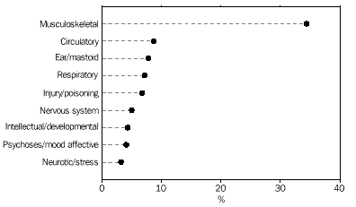 Also, in addition to asking questions on employment limitations of persons aged 15-64 years, the 1993 survey asked questions of persons aged 65 years and over, if they had not stated that they had retired. The effects of these changes, and other factors such as the population ageing, combined to show an additional 1.4 per cent of the population with a disability and an additional 1.2 per cent of the population with a handicap. If the 1993 survey had been conducted using categories identical to those used in 1988, analysis of this data shows that 16.6 per cent of the population would have been identified with a disability and 13.0 per cent with a handicap, compared with the 18.0 per cent for disability and 14.2 per cent for handicap reported in 1993. The 1988 survey found that there were 15.6 per cent of the population with a disability and 13.0 per cent of the population with a handicap. If the 1988 survey is standardised to the 1993 population, by multiplying the 1992 population in each age group by the proportion identifies as having a disability or a handicap in 1988 and summing the results, it shows that 16.0 per cent of the population has a disability and 13.4 per cent of the population had a handicap. Based on these calculations, it would seem that there has been a small increase in the proportion of persons with a disability (from 16.0% to 16.6%) and a small decrease in the proportion of persons with a handicap (from 13.4% to 13.0%). COMPARISON OF PROPORTIONS OF DISABILITY AND HANDICAP 1988, 1993 Actual 1993 data using 1988 data using Actual1993 data 1988 categories 1993 age structure 1988 data Disability 18.0 16.6 16.0 15.6 Handicap 14.2 13.0 13.4 13.0 Demographic Characteristics In 1993, of the 18.0 per cent (3,176,700) of the Australian population with one or more disabilities, 51.0 per cent were males and 49.0 per cent females. The distribution of disability across all States and Territories reflected the national figures, except in South Australia (20.6%), which was 2.6 per cent higher than the national average and the Northern Territory (12.3%), which was 5.7 per cent lower. The lower rate for the Northern Territory is due to the younger age structure. (See Glossary for Disability and Handicap Rates). For all age groups more males than females reported a disability (18.4 per cent and 17.6 per cent, respectively). However, the 60-64 year age group showed the largest difference with 43.2 per cent of males and 29.6 per cent of females reporting a disability. In 1993 95.0 per cent of persons with one or more disabilities lived in households, 18.7 per cent of these living alone. The proportion of persons living alone increases as age increases, both for persons with a disability and for persons without a disability. In the 0-24 year age group in households, 2.5 per cent of persons with a disability and 1.0 per cent without a disability live alone, compared with 39.9 per cent and 41.7 per cent respectively in the 75 year and over age group. Of all persons in households, 17.3 per cent have one or more disabilities, compared with 95.0 per cent of persons in establishments. Severity and Area of Handicap Of the 2,500,200 persons with a handicap, the most frequently reported area of handicap was mobility where 1,827,500 or 73.1 per cent reported mobility limitations. The next most frequently reported area of handicap was employment where 1,497,900 or 60 per cent of persons with a handicap reported employment limitations. Four levels of severity of handicap were identified for the 1993 Survey of Disability, Ageing and Carers - profound, severe, moderate and mild. The largest category was mild handicap with 941,800 or 37.7 per cent of all person with a handicap. Of all males with a handicap 160,000 (13.0%) has a profound handicap, 133,500 (10.9%) had a severe handicap, 226,200 (18.4%) had a moderate handicap, and 482,100 (39.3%) had a mild handicap. For females with a handicap 259,900 (20.4%) had a profound handicap, 167,600 (13.2%) a severe handicap, 229,200 (18.0%) a moderate handicap, and 459,600 (36.1%) a mild handicap. The remainder of persons with a handicap were classified as 'severity not determined'. This category includes persons who had a schooling limitation or an employment limitation only, children who were aged less than five years, or persons whose only limitation was 'does not use the toilet'. In all States and Territories the distribution of the area and severity of handicap was similar to the national estimates. There were 51,500 males aged 75 years or more, with a profound handicap, compared with 138,400 females, giving a sex ratio (males per 100 females) of 37.2. The sex ratio for persons aged 75 years or more, with a handicap, is 59.2 and for all persons in this age group is 60.2. Therefore, while some of the predominance of profound handicap in females is due to the age structure of the population, it cannot all be explained in this way. The remainder of the age categories, by the level of handicap, do not display any marked differences between males and females. Disabling Conditions Disabling conditions, such as respiratory diseases or mental disorders, were reported in response to a set of questions designed to identify the presence of a limitation, restriction or impairment. The main disabling condition is the condition, identified by a person with multiple conditions, as the condition causing the most problems. Where only one condition was recorded, this was considered to be the main disabling condition. Eleven categories have been used to group the main disabling conditions in this publication, with nine conditions classified as physical disorders. GRAPH 2: PERSONS WITH A DISABILITY, TYPE OF MAIN DISABLING CONDITION The conditions most frequently reported by persons with a disability were arthritis and other musculoskeletal conditions 27.2 per cent (863,300); disorders of the ear and mastoid process 14.2 per cent (450,000); all mental disorders 11.1 per cent (