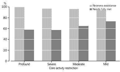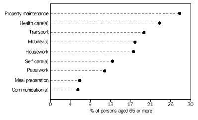 Underlying health conditions Disability usually exists as a consequence of disease, disorder or injury. In 1998, physical conditions, including musculoskeletal disorders such as arthritis, were the most common cause of disability (85%). However, 15% of people with a disability identified a mental or behavioural disorder as their main condition. Because of the greater numbers with physical disorders, most people with a severe or profound core activity restriction had a physical disorder as their main condition (78%). However, people whose main condition was a mental or behavioural disorder were more likely to be profoundly or severely restricted than those with a physical condition (47% compared with 29%). The vast majority of people with dementia had profound restrictions (94%). Of people with an intellectual or developmental disorder as the main condition, 47% were profoundly or severely restricted. Disorders reported as main condition causing disability, 1998 People reported a wide range of causes for the condition leading to their disability. The most commonly reported reasons were: 'Just came on/due to old age' (25%) and 'Accident or injury' (16%). For those with hearing disorders, 29% reported 'Working conditions, work or overwork' as the cause. Assistance In 1998, 57% of the 3.4 million people with a disability living in households needed assistance to move around or go out, shower or dress, prepare meals, do housework, light property maintenance or paperwork, or communicate. Most people in need of assistance received some help: 64% had their need fully met, and 32% partly met. However, there were 4% who felt their needs were not met at all. The proportion of people receiving help varied with the severity of restriction. People with profound or severe restriction who needed assistance were very likely to receive help; however, they were less likely to have their needs fully met than those with milder restrictions. Persons with a disability who need assistance, 1998 Most people with a core activity restriction received assistance from relatives and friends, chiefly partners, parents and children: 97% of people with profound or severe core activity restrictions and over 80% with moderate or mild restrictions received informal assistance. Formal providers of assistance such as home care workers and voluntary workers were used by just over half of the people with profound/severe (53%) or moderate (51%) restrictions. Older people In 1998, there were 2.3 million people aged 65 and over, including 976,500 who were aged 75 and over. The vast majority lived in private dwellings (91%), while a small proportion (7%) lived in cared accommodation such as nursing homes or aged care hostels. The remainder (2%) lived in other non-private dwellings, such as boarding houses. Of people aged 65 years and over, 54% had a disability. Nearly all older people in cared accommodation (97%) had a disability, and most (82%) had a profound core activity restriction. In contrast, 50% of older people in private dwellings and 54% in other non-private dwellings had a disability. The prevalence of profound core activity restriction was also lower in both these latter groups (9% and 11%). Need for assistance Less than half (46%) of all older people needed assistance. Older people's need for assistance with everyday activities increased with age regardless of whether or not they had a disability. Older people aged 85 or more had a markedly higher need for assistance than those aged 65-74 (92% compared with 32%). Older People's Need for Assistance by Age, 1998 Older people most commonly needed assistance with property maintenance and health care. Other common areas of need were transport, mobility, housework and self care. Family and friends were the main providers of assistance although 59% purchased or received formal help. Partners and children were the usual informal providers of help to older people. Of the 710,900 receiving informal assistance, 294,900 (41%) were assisted by partners, who were probably older people themselves. Activities where assistance needed by older people, 1998 (a) Need for assistance with personal activities was only collected from people with a disability. CARERS All providers of assistance In 1998, there were 2.3 million people who provided some assistance to those who needed help because of disability or ageing. Both males and females were well represented as carers, although a majority of these people were female (56%). Of those providing some assistance, 887,800 (38%) were in the 35-54 age range when caring responsibilities may involve children, partners and ageing parents. A further 181,100 were children under 18, and 133,300 were people aged 75 and over. All people providing assistance, 1998 Primary carers are those who provide most informal assistance with personal activities to a person with a disability and therefore caring plays a major part in their lives. In 1998, 19% (450,900) of all people providing assistance were primary carers, and most of these (70%) were female. Most primary carers (79%) cared for a person in the same household. Primary carers by age, 1998 COMING SOON Summary tables for each State and Territory will be released in May 1999. DISABILITY, AGEING AND CARERS: SUMMARY OF FINDINGS, AUSTRALIA, 1993 MAIN FEATURES INTRODUCTION This publication summaries the main findings of the 1993 Survey of Disability, Ageing and Carers, providing estimates of the numbers and main characteristics of persons with disabilities, persons with handicaps, persons aged 60 years or more and carers. The survey was conducted in private and special dwellings as well as in establishments such as hospitals, nursing homes, hostels and retirement villages. A person was identified as having a disability if he/she had one or more of a group of selected limitations, restrictions or impairments which had lasted, or was likely to last, for six months or more. (See glossary for more details on disa