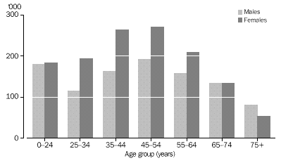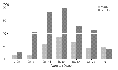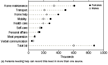 Need for Help: Older Persons All persons aged 60 years or more living in households were questioned about their need for help with home help, home maintenance, meal preparation, personal affairs and transport. This section considers help in relation to only those activities. There were 1,106,900 persons aged 60 years or more, living in households, who reported needing help with at least one of these activities. The activity where help was most frequently needed was home maintenance where 804,700 persons reported needing help. This was followed by a need for help with transport by 658,100 persons. Of the 1,106,900 persons aged 60 years or more, needing help, 760,400 or 68.7 per cent were persons identified as having a disability. Those persons with a disability needed most help in the area of home maintenance (613,100), whereas persons with no disability, of the same age, most frequently needed help with transport (203,800). Of all persons aged 60 years or more, with a disability, living in households 59.9 per cent reported needing help with one or more of the above activities. A larger proportion of females than males, aged 60 years or more living in households, reported a need for help. Females needing help represented 71.9 per cent of all persons needing help in that age group. However, females represented only 55.9 per cent of all persons aged 60 years or more living in households. Considering persons in households, in that age group with a disability, 50.7 per cent were females, but of those with a disability who reported needing help, 66.0 per cent were females. Both sexes reported home maintenance as the activity for which help was most frequently needed. Of persons in that age group with no disability (who reported a need for help), 84.8 per cent were females, with males most frequently needing help with home maintenance and females with transport. Over all age groups, more females reported needing help than males. This difference was greatest in the 75-79 year age group where 75.8 per cent of persons needing help were females, although they made up only 58.1 per cent of the total population, in households, in that age group. Principal Carers In 1993 there were 577,500 principal carers aged 15 years and over, who cared for a person with a handicap. This is 4.2 per cent of the Australian population aged 15 years and over. Of these principal carers, 425,200 cared for a person in the same household and 152,300 cared for a person who lived outside their household. For both usual resident and non-usual resident carers, females provided the majority of care. There were 273,700 or 64.4 per cent female carers and 151,500 or 35.6 per cent male carers who cared for another person in the same household. The difference was even greater for carers living outside the household with almost three quarters of the carers in this category being females. The predominance of female carers over male carers was consistent over all States and Territories, whether caring for a person in the same household or for a person in another household, with little fluctuation from the national average when caring for a person in the same household. Document Selection These documents will be presented in a new window.