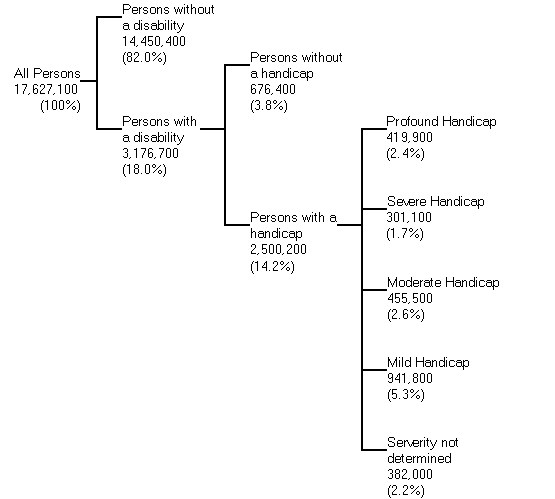 The division of the population according to disability, handicap and severity of handicap is illustrated in Diagram 1 below. DIAGRAM 1. ALL PERSONS: NUMBER AND PROPORTIONS OF PERSONS WITH A DISABILITY AND PERSONS WITH A HANDICAP BY SEVERITY OF HANDICAP The number of persons living in households was 17,460,600, and of those 17.3 per cent had a disability, while there were 166,500 living in establishments and of those 95.0 per cent had a disability. It was estimated that 2,762,900 persons, or 15.7 per cent of the Australian population, were aged 60 years or more. Of these, 50.9 per cent had a disability and 43.1 per cent were also classified as having a handicap. 577,500 persons were principal carers (those who provide the most care for persons with a disability, in the areas of self-care, mobility or verbal communication), representing 4.2 per cent of the Australian population aged 15 years or more. Disability and Handicap Disability and handicap are strongly related to age. The rates for both increased rapidly for those aged 45 years and over, for males and females. However, the rates for disability without handicap reached a maximum for persons aged 70-74 years and then showed a decrease, as older persons are more likely to have a handicap resulting from their disability. Children aged 0-4 years were taken as a base population for comparing the increasing frequency of handicap with age. The handicap rate at age 35-44 years is approximately double that for children aged 0-4 years. By age 60-64 years, the handicap rate is approximately seven times that for children aged 0-4 years and by age 75 years and over, the rate is about fourteen times that found for children aged 0-4 years. Disability rates follow a very similar pattern, as most persons (78.7%) with a disability are also classified as having a handicap. Disability and handicap rates ( the number of persons with a disability or a handicap per thousand population) were calculated for each State and Territory. Because of the strong relationship between age and disability, an age standardised rate, standardised to the national population age structure at March 1993, was also calculated. This removes any differences due to the differing age structures between each State and Territory. (See table below.) HANDICAP AND DISABILITY RATES BY STATES AND TERRITORIES