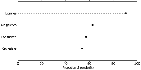 This statement of support came from people whether or not they attended or used these facilities. For example, among those people who had not been to an art gallery in the previous 12 months, 65% rated them as being important or very important in their community, while 92% of those who had not been to a library rated libraries in the same way.