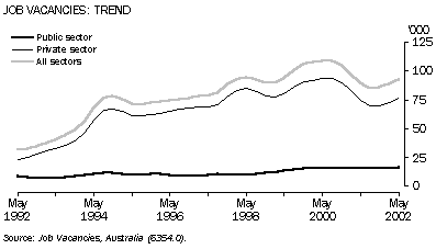 The number of job vacancies has increased considerably over the last ten years, particularly in the private sector. In May 2002 there were 74,900 private sector vacancies and 15,400 public sector vacancies, up from the 23,400 private sector vacancies and 8,400 public sector vacancies recorded in May 1992.