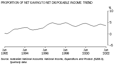 The ratio of national net saving to national net disposable income in quarterly trend terms is shown in the following graph. The ratio was particularly low during the recession in the early 1990s. In recent years it has been around 4%, and in the June quarter 2002 the ratio was 3.6%.