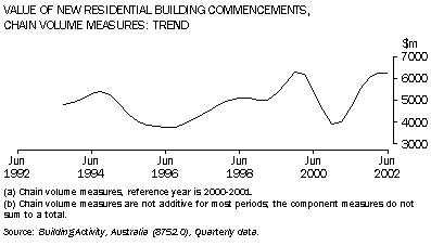 Residential building is a volatile segment of construction activity. It is sensitive to general economic conditions and shocks such as interest rate changes. Preceding the introduction of The New Tax System in July 2000, a substantial amount of construction activity was brought forward, peaking in December quarter 1999. A severe downturn followed this peak, but was quickly reversed by a combination of historically low interest rates, government incentives (e.g. The First Home Owners Grant) and strong underlying demand for new dwellings.
