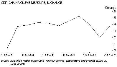In chain volume terms (i.e., after allowing for changes in prices) Australia's GDP increased by 3.8% in 2001-02 compared with 2000-01. This continued the strong growth rates since 1992-93, during which time the average annual growth rate was 4%. Growth rates have been above 3.5% for every year during this period, apart from 2000-01 when the growth rate fell to 2%