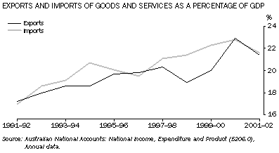 Australia's balance of payments records transactions between Australia and the rest of the world. The current account deficit during 2001-02 was $22b, or 3.1% of GDP. This deficit is mostly due to an excess of $2b in imports of goods and services over exports and net income payable to non-residents of $20b. During the last 10 years the current account deficit as a percentage of GDP fluctuated, with a high of 6.0% in 1994-95 and a low of 2.7% in 2000-01. Both exports and imports became increasingly more important to the Australian economy during this period. When expressed as a percentage of GDP, exports rose from 17% in 1991-92 to 21% in 2001-02, while over the same period imports rose from 17% to 22%. Australia's terms of trade - which reflects changes in the prices of exports relative to those for imports - improved by 2.6% in 2001-02 which is the third consecutive year of improvement.