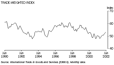 During the 1990s, the value of the Australian dollar ($A), as measured against other currencies in the trade-weighted index, was quite volatile. The index fell from a high of 61.6 in September 1990 to 47.8 in September 1993, before recovering over the latter part of the decade to reach 58.3 at June 1999. Since then, it fell again, to 52.9 in June 2000, increasing slightly to 53.4 by June 2002.
