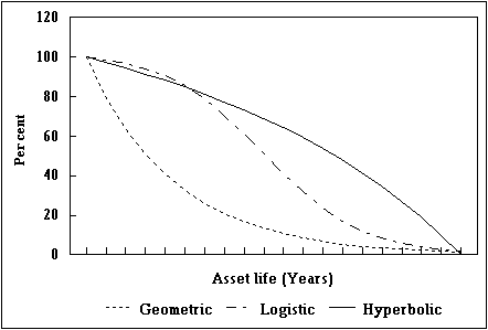 16.19 There is a lack of empirical data about the shape of age-efficiency functions, and the choice is a matter of judgement. Although capital stock levels are sensitive to the shape of the age-efficiency function, average growth rates are not. (In fact, if real GFCF is held constant over time, the choice would have no impact on the capital stock growth rate, but it would affect the capital stock level.) The ABS has chosen to use hyperbolic functions, the same approach as that used by the US Bureau of Labor Statistics (BLS). That is, the efficiency of the asset declines by small amounts at first and the rate of decline increases as the asset ages.