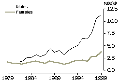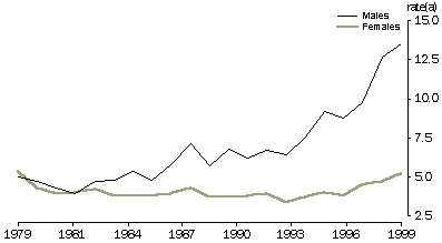 The overall increase in drug-related deaths over this 20 year period was driven primarily by increases in drug-related deaths of males. In 1979, males and females had similar standardised drug-related death rates (around five deaths per 100,000 population). By 1999, the rate for males had grown to almost 14 deaths per 100,000 while the rate for females was still around 5 per 100,000. Consequently, males accounted for 72% of drug-related deaths in 1999 compared with 48% in 1979.