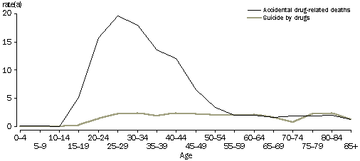 Rates of suicide by drugs were relatively constant among all ages from 25 years on, with age-specific death rates around 2 deaths per 100,000 population. In contrast, the rate for all suicides peaked among 20 to 34 year olds and declined with increasing age. However, as a proportion of all suicides, drug suicides increased with age, with 13% of suicides of people aged 50 years and over from drugs, compared with 3% for those aged less than 20 years.