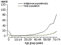 Age-specific death rates In 1998-2000, Aboriginal and Torres Strait Islander males and females at all ages had higher age-specific death rates compared with the total population. In the younger age groups (less than 30 years), and among those aged 65 years and over, death rates for Aboriginal and Torres Strait Islander peoples were approximately four times that of the total population. However, between the ages of 30 and 64 years the death rates of Indigenous Australians were around seven times the rates for the total population in those age groups.