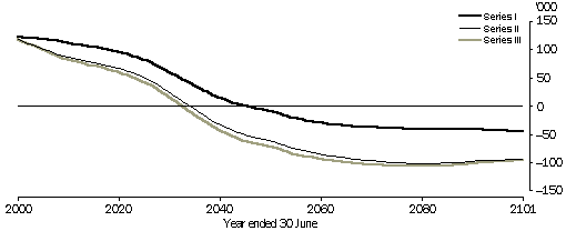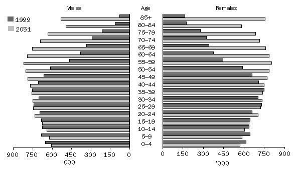 Australia's population growth Australia's population is projected to grow from 19 million in 1999 to between 22 and 24 million in 2021, 24-28 million in 2051, and 23-32 million in 2101. Based on assumptions of relatively high fertility combined with high net overseas migration, Series I projects continuous growth, at declining rates, throughout the 21st century. In Series II (low fertility, medium migration) the population peaks at around 26 million in 2064, then declines gradually. In Series III (low fertility, low migration) the population peaks earlier (in 2049) and lower (at 24 million), then declines more rapidly than in Series II. The growth rate, and ultimate size, of each of these projected populations reflects the interaction of two components of growth: natural increase (excess of births over deaths) which is determined by the combination of assumptions about fertility and mortality; and net overseas migration. PROJECTED POPULATION, AUSTRALIA Source: Population Projections, Australia, 1999 to 2101 (cat. no. 3222.0). Throughout the twentieth century, natural increase has been the main component of population growth, contributing about two thirds of total growth during the period. However, natural increase is projected to fall rapidly during the first half of the 21st century, reaching zero between 2033 and 2046, depending on the series used. The projected decline in natural increase is mainly the result of increasing numbers of deaths rather than decreasing numbers of births, though Series II and III do project some decline in the number of births. In all three series, the number of deaths is projected to increase rapidly between 2031 and 2051 as the large cohort of post World War II ‘baby boomers’ moves into the 85 years and over age group. As the projected levels of natural increase continue to decline, the assumed levels of net overseas migration, make an increasingly important contribution to either maintaining population growth (Series I) or moderating population decline (Series II and III). As well as the immediate effect on population numbers, overseas migration also contributes to births, deaths and consequently, to natural increase. The difference in natural increase between Series II and Series III, which have the same assumptions of fertility and mortality, can be attributed entirely to the natural increase contributed by the 20,000 per year difference in assumed net overseas migration between the two series. PROJECTED NATURAL INCREASE, AUSTRALIA Source: Population Projections, Australia, 1999 to 2101 (cat. no. 3222.0). Population ageing The structural ageing of Australia's population, evident since the 1970s, can be attributed to the sustained decline in fertility which followed the post-war baby boom. Based on assumptions of continuing low fertility (even the ‘high’ fertility assumption of 1.75 births per woman is below replacement level) and a small increase in life expectancy, Australia's population is projected to continue ageing into the next century. As the large baby boom generation ages, the number of older people is projected to increase rapidly. In Series II, as the youngest of the surviving baby boomers reaches 65 years of age in 2031, the population aged 65 years and over is projected to reach 5.4million (more than double the number in 1999) and represent 22% of the total population (compared with 12% in 1999). As the youngest baby boomers reach 85 years of age in 2051, the population aged 85 years and over is projected to reach 1.3 million (more than five times the number in 1999) and represent 5% of the total population. AGE STRUCTURE OF THE PROJECTED POPULATION, AUSTRALIA-SERIES II Source: Population Projections, Australia, 1999 to 2101 (cat. no. 3222.0). Reflecting their longer life expectancy, women outnumber men in the older age groups, particularly in the group aged 85 years and over. In 1999, women made up 69% of the 85 years and over age group. In all series this proportion is projected to fall to 59% by 2051, based on the assumption that the current trend for men's life expectancy to improve more rapidly than women's will continue into the future. Reflecting the large increases in the numbers of people aged 45 years and over, and slight declines in the numbers of children, the median age of the population is projected to rise rapidly from 35 years in 1999 to between 44 and 47 years in 2051. Beyond this point, there is little change in the median age, reflecting the relatively static age structure which is a result of assumptions of fertility, mortality and migration being held constant to the end of the projection period (2101). Because immigrants have a younger age profile than the total population, the initial effect of any migrant intake on the population is to slightly lower its median age. However, because migrants age over time with the rest of the population, the long-term effect of net overseas migration on population ageing is minor compared with its effect on population size. For example, the difference in assumed net overseas migration between Series II and Series III (20,000 per year), results in only half a year difference in median age between the two series in 2051, while the difference in population size is 1.3 million. MEDIAN AGE OF PROJECTED POPULATION, AUSTRALIA Source: Population Projections, Australia, 1999 to 2101 (cat. no. 3222.0). State and Territory population growth Projected population growth varies considerably across Australia's States and Territories and reflects the interaction of three components: natural increase; net overseas migration; and net interstate migration. In each of the three fastest growing populations (i.e. the Northern Territory, Queensland and Western Australia), growth is dominated by different components. In the Northern Territory natural increase contributes over 80% of projected population growth. This results from assumptions of relatively high fertility applied to a relatively young 