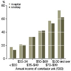 (b) Includes other reasons. (c) Given by those with insurance; more than one reason could be given. Source: Health Insurance Survey, 1998 (ABS cat. no. 4335.0). Characteristics of people insured Over the 1990s, ABS surveys have found that: women are more likely to be covered by private health insurance than men; coverage is highest among the middle-aged; and an increase in the likelihood of being insured is associated with higher income. In addition, people with government health care cards, most of which are means-tested and which make health care more affordable and accessible, are less likely to have some kind of health insurance than others. These factors are interrelated: average incomes are highest among the middle-aged, for example. People on low incomes, the elderly and one-parent families are more likely to be covered by health care cards than are others. In June 1998, 34% of women and 32% of men (aged 15 years and over) were covered by hospital insurance. For ancillary insurance the difference was also slight: 31% of women were covered, compared with 29% of men. The proportion of the population covered by hospital insurance was lowest among those aged 15-24 years (25%) and was highest for those aged 45-54 years (43%). The proportion covered in each age group over 54 years was progressively lower, falling to 35% among those aged 75 years and over. A broadly similar pattern was observed for ancillary insurance, although there was a greater fall-off in coverage in the older age groups for this type of insurance. The proportion of those aged 75 years and over with ancillary insurance (22%) was the lowest of any age group.