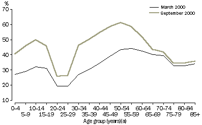Age of new members During the period when the membership of health funds was declining, a particular concern was that funds would develop a top-heavy age structure, as membership was declining faster in younger age groups than in older age groups. As older age groups tend to make heavier use of health services, this would have implications for the financial viability of the health funds. The changes to the age pattern of coverage which occurred between the March and September quarters of 2000 went some way to reversing this trend. Although coverage increased in every age group, the greatest increases occurred among people aged from 30-49 years, for whom the incentive to join a fund was greatest under Lifetime Health Cover arrangements. The 72% increase in the number of 30-34 year olds covered was the greatest proportional increase of any five-year age group. There were also relatively high increases in coverage of children aged under 15 years (ranging from 50% to 58%), reflecting the large number of parents taking out coverage for their families. PROPORTION OF THE POPULATION WITH HOSPITAL INSURANCE, MARCH AND SEPTEMBER QUARTERS, 2000 (a) Proportion of the population of each age group covered by hospital insurance. (PHIAC data on the age pattern of ancillary insurance is not available.) Source: Private Health Insurance Administration Council, Membership and Coverage Statistics, <URL:www.phiac.gov.au/phiac/stats/MemCovIndex.htm> (Accessed 9 March 2001). Endnotes 1 Department of Health and Aged Care, 1999 Occasional Papers, Health Financing Series volume 1, no 4, Private Health Insurance (Submission to Community Affairs Legislation Committee regarding the 30% rebate on private health insurance) <URL:http//health.gov.au/pubs> (Accessed 7 January 2001). 2 Australian Bureau of Statistics 1998, Health Insurance Survey, 1998, cat. no. 4335.0, ABS, Canberra. 3 Private Health Insurance Administration Council 2001, Membership, Coverage and Financial Statistics <URL:www.phiac.gov.au/phiac/stats/MemCovIndex.htm> and <URL:www.phiac.gov.au/phiac/circs_pubs/OldAnnRpt/1999T2to8.xls> (Accessed 9 March 2001).