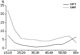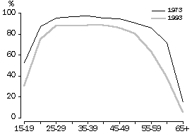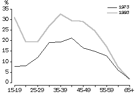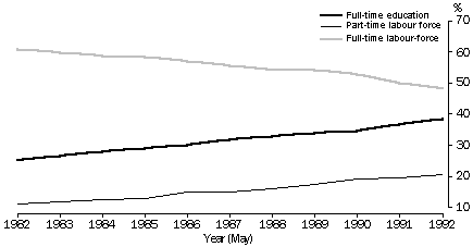 Source: Labour Force Survey Demographic characteristics The majority of part-time workers (75% in 1993) are women and the increasing participation of women in the labour force has been one of the major factors on the supply side of the labour market associated with the increase in part-time employment. The female labour force participation rate increased 10 percentage points between 1973 and 1993, rising from 41% to 51%. Over 90% of the increase was due to an increase in participation in the part-time labour market. Increasingly women are combining work with family responsibilities and part-time work provides an important means of achieving this. In 1993 the incidence of part-time work was highest among married women at 47% compared to 35% for unmarried women. The incidence of part-time work among men in 1993 was 10%. Students are another important source of part-time labour and the increase in participation in education among 15-24 year olds, particularly through the 1980s, has been another important trend contributing to an increase in the supply of potential part-time workers (see Education - National summary tables). Participation in full-time education among 15-24 year olds increased from 25% to 38% between 1982 and 1992. Over the same period participation in the full-time labour force by 15-24 year olds declined, from 61% to 48%, while participation in the part-time labour force increased, from 11% to 21%. About 40% of the overall increase in participation in the part-time labour force between 1973 and 1993 was due to increased participation by 15-24 year olds, a large proportion of whom are students. One other group which requires special mention with respect to part-time work is older male workers, particularly those in retirement. Although men in the 55-64 year age range represented only a little over 3% of the total part-time labour force in 1993, 12% of those who were working, worked part-time, compared to 6% of men aged 25-54 years. This partly reflects the use of part-time work as a means of easing into retirement (see Early retirement among men). EDUCATION AND LABOUR FORCE PARTICIPATION OF 15-24 YEAR OLDS Source: Labour Force Survey; Survey of Transition from Education to Work. Part-time work and unemployment The fact that such a large proportion of the pool of people working or wishing to work part-time are married women and students impacts on the relationship between employment growth and unemployment. A number of researchers have argued that among these particular groups a large proportion are likely to have been outside the labour force prior to obtaining a job. Similarly, if married women or students lose their part-time jobs they are likely to leave the labour force, rather than enter the pool of unemployed for any extended period. In essence this means that many of the participants in the part-time labour market effectively bypass the unemployment pool upon entering or exiting the labour force. This has critical implications for the way in which job growth affects measured unemployment. As the mix of new jobs changes, with more jobs being part-time, the effect of overall job growth on measured unemployment is diminished. This partly explains why at the present time Australia has a high unemployment rate despite many years of high overall employment growth. Some support for this argument can be found in the fact that increases in part-time work have corresponded with increases in participation in the labour force by women, particularly married women, and students. Some support can also be found in the fact that in 1992, 67% of people outside the labour force who wanted to work said they would prefer a part-time job. Moreover, 64% of discouraged jobseekers i.e. people who had left the labour force because they could not find a job, also said they would prefer part-time work. At the same time only 14% of the people who were unemployed said they were looking for part-time rather than full-time work. Underemployment The majority of people working part-time do so by choice. Nevertheless, with the growth in unemployment in recent years the number of people working part-time who would prefer more hours has been increasing, as has the number of full-time workers forced to work part-time hours because of lack of work. Combined, these two groups of workers comprise the underemployed. In 1993, 580,000 people were underemployed, a slight decline from the previous year. The underemployment rate (underemployed expressed as a percentage of the labour force) was 7%. About 12% of the underemployed were full-time workers stood down or on short time because of insufficient work. The remainder, just over half a million, were part-time workers. Of these, 186,000 (36%) had actively looked for full-time work in the four weeks prior to the survey. The half million underemployed part-time workers represented 28% of all part-time workers in 1993. 62% of underemployed part-time workers were women compared to 75% of all part-time workers. The highest incidence of underemployment among male part-time workers was in the 25-34 years age group of whom 60% wanted to work more hours. The highest incidence of underemployment among women was 43% in the 20-24 years age group. Overall, 44% of male part-time workers were underemployed compared to 23% of female part-time workers. UNDEREMPLOYMENT AND UNEMPLOYMENT RATES Source: Labour Force Survey; Survey of Transition from Education to Work. TOTAL AND UNDEREMPLOYED PART-TIME WORKERS, AUGUST 1993