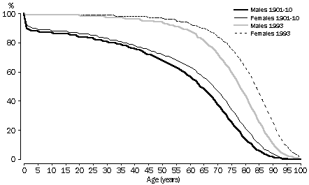 Life expectancy for men and women In 1993 a new-born girl had a life expectancy 6 years greater than a new-born boy. This life expectancy advantage of females over males has varied over time. Throughout the early part of this century it was about 4 years. In the latter half the difference increased, peaking at 7 years in the early 1980s. Since then the difference has steadily declined. The difference in life expectancy between males and females has been attributed to both biological and environmental factors. Females are estimated to have a genetic advantage of about two years of life over males4. The remaining differences are attributed to the different behavioural and lifestyle patterns of males and females which result in different mortality rates. For example, in 1981, the life expectancy difference between females and males at birth was 7 years. The major reasons for this difference were the different death rates for males and females from heart disease; bronchitis; emphysema; asthma; cancers of the lung, trachea and bronchus; and accidents, particularly motor vehicle accidents5. These causes of death are related to smoking (see Australian Social Trends 1994, Tobacco use), which is more prevalent among men, and the risk taking behaviour of men, particularly young men. Since the early 1980s, the difference in life expectancy between males and females has decreased while average life expectancy for both men and women has continued to increase. This has been due to the faster decline of mortality rates among males than females. DIFFERENCE BETWEEN FEMALE AND MALE LIFE EXPECTANCY AT BIRTH Source: Death Registrations Survival In 1901-10 half of new-born boys could have been expected to reach 64 years of age and half of new-born girls could have been expected to reach 68 years of age. The equivalent figures in 1993 were 78 years for males and 84 years for females. The high mortality at young ages in 1901-10 is vividly demonstrated by comparing the survival curves with those for 1993. In 1901-10, 25% of males would have died by the age of 42 years and 25% of females by the age of 45 years (if the age-specific death rates had remained constant). In 1993, mortality rates were much lower and, if they remained constant, 25% of males would die before the age of 69 years and 25% of females before the age of 76 years. Comparison of survival ages for the longest living 25% of each group reveals a smaller difference between 1901-10 and 1993. During 1901-10, 25% of males would have still been alive after 75 years and 25% of females after 79 years. In 1993, the period will be 85 years for males and 90 years for females. PROPORTION OF PEOPLE SURVIVING TO A GIVEN AGE (SURVIVAL CURVES) Source: Australian Life Tables; Death Registrations