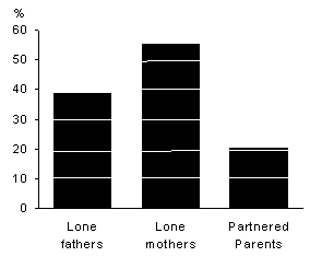 Lone parents are more likely to rent their accommodation than partnered parents. In 1991, 55% of one parent families were renting a home compared to 21% of two parent families. Lone fathers were less likely than lone mothers to have been renting (41% compared to 57%) with most of the difference being in the proportion who were renting public accommodation.