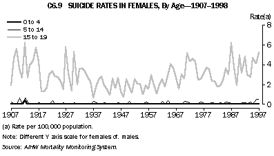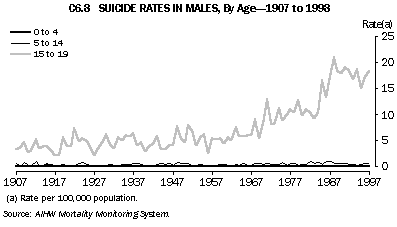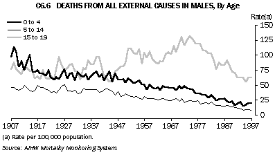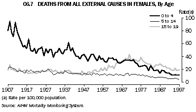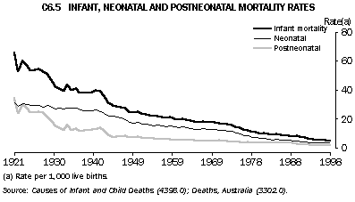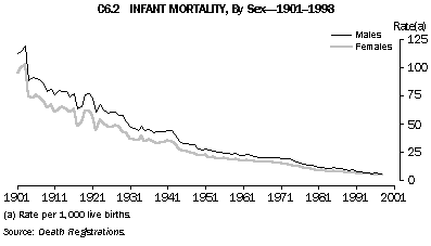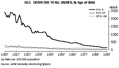 Source: The Bulletin Magazine (originally published 21 April 1900). The social and economic environment around 1901 was harsh and difficult for many families; many children were malnourished and likely to die from infectious diseases such as gastroenteritis and pneumonia. The considerable social, educational and income changes over the century (described in Centenary Articles associated with the Population, Income and welfare and Education and training chapters), together with the conscientious efforts of those committed to improving maternal and child health in the early decades by community interventions, have had as much influence on reducing deaths and illnesses in children as has the extraordinary rise in knowledge in biomedical science in later decades, with its resulting improvements in diagnosis, treatments and prevention of disease (particularly by mass vaccination). In many ways, this last century has been a glorious one in which to have been involved as a child and public health professional. While the perinatal and infant period is still one of life’s most risky, the chances of survival now are much higher than 100 years ago, and once through to the end of the first year, the risk of dying in childhood is very low and only starts to rise again in older teenagers (15-19 years old), particularly in males. However, there is now possibly excessive emphasis on using expensive technologies to prevent death in children who are severely compromised, with much less effort into researching the antecedents to prevent the conditions which lead to the problems in the first place. And in later childhood and adolescence, risks are dominated by factors associated with lifestyle and mental health problems which require a complex range of preventive strategies over many years. This article is an overview of the changes in some markers of child and adolescent health throughout the 20th century and those trends which have been most influential. Many aspects will not be covered adequately and some left out completely, due to limitations of space and time. The hope is that the messages about the most important aspect of our future as a nation - the health of our children - will be heard and responded to. CHILD MORTALITY IN THE 20th CENTURY Mortality as a measure of health One major way in which epidemiologists measure health is actually to measure death. "This preoccupation is not so morbid as it sounds. In modern times the news has been almost entirely good. Western countries have doubled their life expectancies from around 40 years in the mid-nineteenth century to almost 80 years at the end of the twentieth. If we were to enter one of those competitions to nominate the greatest advance of the latter part of the millennium, it would be difficult to overlook the pushing back of the frontiers of death and the guarantee that most people will live to old age” (Caldwell 1999). The data on mortality below have been compiled by the Australian Institute of Health and Welfare (AIHW) Mortality Monitoring System from official death registrations. The under five mortality fell from 2,604 per 100,000 in males and from 2,214 in females in 1907 to 137 and 111 respectively in 1998 (graph C6.1). More than 50% of the fall had occurred by 1930 and most (more than 80%) by 1960. The rates at the end of the century are very low. The most important contribution to under 5 mortality was death in infancy (see below). The death rates in 1-4 year old children were much lower throughout the last 100 years, although the pattern of their fall was similar to infant death rates. Once a child survived beyond its first year, even in early 1900s, its chances of survival were good. Now they are excellent. In children aged 5-14 and 15-19 years the rates were initially much lower than in younger children and have fallen steadily. For 5-14 year old males the rate was 187 in 1907 and 17 in 1998; for females 172 falling to 12. In 15-19 year old males, the rate was 267 in 1907 and 75 in 1998; for females 237 and 37 respectively. Infant mortality Infant mortality, defined as deaths in children from birth to the first year of age per 1,000 live births, has been viewed traditionally as an important social indicator, reflecting general population health and wellbeing. It is of great interest to those assessing the social development of communities as groups with more advanced development in terms of social circumstances, educational level and income tend to have lower rates of infant mortality than those with less development. Infant mortality is strongly related to fertility rates and to life expectancy at birth. Falls in infant and childhood deaths have been shown to be followed by declines in fertility (Caldwell 1999). Infant mortality, influenced by preventive health measures, which include social improvements, is used as a measure of such services for a population. Graph C6.2 shows the infant mortality rate per 1,000 live births from 1901 to 1998. Female death rates are always lower than male rates for reasons that are still not clear. The rate fell from around 120 for males and 100 for females at the beginning of Federation to below 60 in the late 1920s. Both male and female rates have remained below 10 since 1986, and the overall rate was 5 in 1998. This compares well with other developed countries. Population data on Indigenous infant mortality have only been available since the 1970s, although Thompson noted that the Northern Territory in the 1960s reported rates of around 150 per 1,000 live births. The best estimates are around 70-80 in the 1970s falling to around 25 in 1980s (Thomson 1991). In 1994-96 it was 18.6, still much higher than that for non-Indigenous infants. Deaths from all causes, particularly from SIDS and respiratory system diseases, are much more common in Indigenous infants. Poor socioeconomic circumstances and living conditions, higher rates of teenage fertility and of low birthweight babies, all contribute to