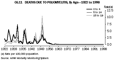 Mothers were educated about infant welfare, particularly the importance of breastfeeding, personal hygiene and clean environments. Mothers of sick children were advised to seek medical help and public hospitals treated children free. Special hospitals for sick babies, most with gastroenteritis, were also established, such as the Lady Edeline Hospital for Babies at 'Greycliff' in Vaucluse. Infant welfare clinics and the home visitor program expanded to postgraduate training for nurses in baby health (infant welfare) at 'Tresillian centres', which sprang up all over the country and were the beginning of community child health in Australia. As MCH improved over the century, breastfeeding became less vital for survival. And artificial feeding was less worrying because special infant formulas became available and the water to make them up was clean. Milk became safer as pasteurisation was introduced in the 1930s. While data on the prevalence of breast feeding at the time of discharge from the hospital of birth are fragmentary, it is recorded that only 40-45% of mothers were initiating breastfeeding in 1970s, a fall from over 50% in 1950s and much lower than the 90% in Armstrong’s day. Hospital staff were less educated about the importance of breastfeeding, and perhaps there was an influence of it not being fashionable as well! Following intensive community campaigns to reeducate women about breastfeeding, there has been a steady upward trend with recent figures in the 1990s of around 76% of new mothers initiating breastfeeding, with over 50% still fully breastfeeding at 3 months (Jain 1996). Maternal education and child health The seminal work of Australian social demographer Caldwell and his colleagues at ANU has described the important effect of parental, particularly maternal, educational level on improved outcome for a child. Even when controlling for family income and access to health services, a child’s chance of survival improves with higher levels of parental education, the relationship with maternal educational level being the strongest (Caldwell 1999). Similar associations are seen with morbidity as well (Silburn, Zubrick et al. 1996). An educated mother is one who is more rational, able to be informed about ways to improve child health, is likely to breastfeed and immunise her child, seek help early if the child is sick and follow instructions in terms of health care. Along with higher levels of education in the first 50 years since 1900 would have come an increasing knowledge about, and belief in, modern medical science and what it could deliver for health. “Educated people for most of the time up to the present have been more likely to use soap, to isolate family members with infectious diseases, to guard their children from danger, to use safe water or to boil it, to boil milk for babies use, to accept immunisation for their children, to take sick children for medical treatment and to follow the prescribed course of treatment" (Caldwell 1999). More recently more women being educated reflects female empowerment, which has been associated with greater control over their own lives and better health for them and their children. This is particularly pertinent to today’s Indigenous families in Australia. Education is now so widespread that its continued importance to child health and care is often taken for granted. Changing concepts about death Caldwell (1999) developed a theory of 'health transition' to explain the changes taking place in traditional societies and communities with high mortality and high fertility to the low levels of both as countries develop. Mortality declined through improved public health, social and behavioural changes, and the use of medical and other technology. A change in the way death is viewed culturally has driven this commitment to survival, with death being viewed as the worst of all possible outcomes (Simons 1989). In eras with high mortality rates, death was not regarded as unusual, whereas as the capacity to survive became possible, there was a strong commitment to reducing risks and to avoid death. Income, material wellbeing and mortality There is a clear ecological relationship between material wellbeing, measured by income or disposable household income for families with children, and their health status. The extent to which one influenced the other and how more income translated into better outcomes is not known. More disposable income for families resulted in better food, clothes, education and better housing-all of which have been associated with improved child mortality and morbidity. Fertility, family size and overcrowding As the fertility of women decreased, the average number of births for women less than 45 years old fell from around 7 before 1900 to 3 in 1920s (Williams 1989). This meant fewer children to look after, less crowding in housing and better provision of those things essential for good health for the children. In 1920s and 1930s there were still many living in crowded and poor industrial areas of large cities and in poor rural areas in inadequate housing and conditions, and unemployment made it hard for families, even those of smaller size, to provide for their children. Advances in medical science Throughout the century, scientific discoveries started to impact upon health and medical services. Before World War II few vaccines were available, the most significant for children being diphtheria and tetanus antitoxoid. Pertussis, polio and other viral vaccines soon followed. The impact of polio on deaths in young children and teenagers is shown in graph C6.11; the graph does not show the large numbers of young people permanently paralysed due to this virus. The effect of vaccination was dramatic (Ada and Isaacs 2000). Infectious deaths fell before widespread vaccination was implemented. However, since the 1950s, mass vaccination has been the single most effective public health measure to reduce the occurrence of infecti