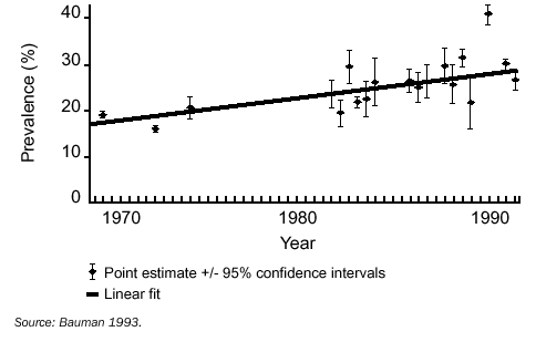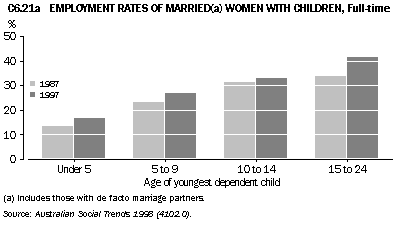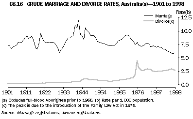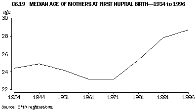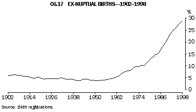 Table C6.15 shows, by age and gender, the proportions of school children classifying themselves as drinkers. By 14 years of age, over half of the boys and girls have started drinking, some on a regular basis. The dramatic increase in females smoking and drinking over the last 50 years has been a major social change. Such behaviour in women was unusual in the early and middle years of last century; now we are faced with the prospect of more young girls smoking and as many drinking alcohol as young boys. With the knowledge about the effects of these on the future health of both boys and girls and for girls, on that of their babies, this is a major public health concern. Australia has been a leader in legislation and health education to reduce cigarette smoking levels in the community. Legislation banning cigarette advertising of any kind was introduced earlier in Australia than in other countries. Recent laws have banned smoking in work and public places, but novel ways need to be found to counteract the clever subliminal advertising of cigarette companies (Daube 2000). Similarly legislation and education about drinking and driving seems to have impacted on accident rates in young people. Obesity, poor physical fitness In the last 20 years, concern has been expressed nationally about the increasing levels of obesity and lack of physical fitness in children and adolescents in Australia (O'Connor and Eden 2000). Two studies (Wake, Lazarus et al. 1999; Lynch, Wang et al. 2000) reported temporal increases in Body Mass Index (BMI, a measure of weight for height) in both Sydney and Melbourne children from age 7 to 18 years, with about 25% of children being overweight. Researchers blame the sedentary lifestyles and diets of children; the intake of fruit and vegetables and of physical activity decreases throughout adolescence (Wake, Lazarus et al. 1999). At the other extreme, there is an epidemic of eating disorders and weight concerns with a desire for thinness among girls, and increasingly among boys as well. Over 30% of 8-12 year old girls have already tried to lose weight (Rolland, Farnill et al. 1997). The longer-term effects of poor adolescent growth are now starting to be described, particularly on bones and on mental health. IMPORTANCE OF SOCIAL FACTORS IN CHILD HEALTH Family structure and interactions, employment and incomes There have been changes in our communities that have had a profound effect on child and adolescent health and wellbeing. The marriage rate reflects the prevailing economic and social conditions. It increased in times of prosperity such as the early 1900s, rose before each world war, fell during it and rose again after it, and fell in times of adversity such as in the 1930s during the Depression. It rose again around the time of the Viet Nam war. Over the last 20 years marriage rates have fallen, and age at first marriage and age at first birth have increased dramatically (graph C6.16). In contrast divorce rates rose in the 1970s, stabilised in the 1980s and have increased slightly through the 1990s. Coincident with the fall in marriage rates, there has been an increase in de facto relationships, which have become more socially acceptable in the last 20 years, even if children are involved. The proportion of births which are ex-nuptial has risen from around 6% in 1901 to 29% in 1998 (graph C6.17); at least half of these births are to women in de facto relationships. The median age at first marriage was around 27 years for males and 24 for females in the 1920s, remained high during the 1930s Depression years and fell dramatically after 1940. It continued to fall until around 1975 when, associated with marked changes in the professional and social development of women, age at marriage increased again to levels similar or even higher than those seen in 1920s. Age of mothers at first birth closely mirrors the trend for age of mothers at first marriage (graphs C6.18 and C6.19). Late in the 19th century the fertility rate was falling; it picked up again as the new century progressed, falling rapidly after the 1929 Depression. Fertility increased to 3 babies per woman in 1947 and peaked at 3.6 in 1961-during this period (1947-61) 3 million babies were born in what has been referred to as the baby boom! The widespread introduction of the contraceptive pill gave women easier and more sure control over their fertility, which fell along with changes in desired family size. Since the 1970s fertility has declined to its lowest rate ever. An increasing part of this fall is contributed by women who decide to remain childless; in the 1990s 27% of women did not have any children. Of those who do, 40% will have 2 children, the most common family size, and only 12% of women would have one child. While there is under-registration or recognition of Indigenous births, some data are available. During the 1960s Indigenous women had a total fertility rate of around 6 babies per woman, which fell during 1970s to about 3 and in the 1990s to 2.4. The age distribution of births is very different for Indigenous mothers compared with non-Indigenous, with many more teenage births (graph C6.3). Divorce and effects on child health and welfare Until 1940 the level of divorce in Australia was negligible, with less than 2 per 1,000 married women. By 1947 when marriages in haste before the war had started to be tested, the rate had risen to around 5. After a decline in the 1950s, divorces started to increase in the 1960s and climbed sharply in 1976, following the introduction of the Family Law Act and 'no-fault' divorce. This allowed only one ground for divorce-an irretrievable breakdown in the marriage measured by the separation of the spouses for at least one year. Divorce rates have been consistently higher in the 1980s and 1990s than at any time before 1975. The most common themes associated with marital breakdown are listed here because of the impact they are likely to have had on children before the 