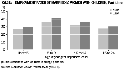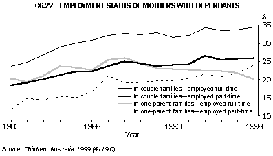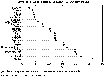 Coincident with these changes in families and communities, the incidence of child abuse-physical, emotional and sexual-is thought to have risen over the last three decades. However the data are incomplete as much goes unrecorded even in those States with mandatory reporting of abuse. Data from the Australian Institute of Health and Welfare show increases in abuse and neglect up to 1994-95, with small falls in later years (table C6.20). All paediatric hospitals now have teams of highly skilled professionals to diagnose and manage these children and their families. In the majority of cases the perpetrator is a close family member or friend. The tragedy of this is illustrated by the proportions of post-neonatally acquired cerebral palsy due to non-accidental injury in WA children, which rose from 3.4% to 14.9% between 1956-75 and 1980-92 (Stanley, Blair et al. 2000). Deaths and cerebral palsy are the 'tip of the iceberg' of damaged children; prevention will need research to identify the best ways to avoid unwanted pregnancies, help young parents, avoid isolation of single parents and provide social support. Employment Apart from the periods of unemployment in the depressions and recessions of the 20th century, the most significant influences in employment impacting on children have been increases in women working (see Characteristics of the labour force in the Labour chapter, and graphs C6.21a, C6.21b and C6.22). The increase in women working has decreased the availability of the 'volunteer' community workforce, so important for schools, care of the aged and other activities. More of this may now need to be provided by local government (see later). Poverty, child health and social security The levels of poverty and disadvantage around 1900 were a powerful influence on the low levels of child health and high death rates of that time. As Australia has grown and developed over the century, the changes have mainly been towards significant improvement. However, as we move into the new millennium, increasing levels of inequity in social and health status are worrying. One in six of the developed world's children live in relative poverty, i.e. below the national poverty line in their country (UNICEF 2000). Australia ranks 15th of the 23 'rich' countries listed, with 12.6% of its children living in households with incomes below 50% of the national median. Sweden had the least (2.6%), and countries with higher levels than Australia included Poland, Canada, UK and USA. Many European countries had lower relative poverty rates than Australia (graph C6.23). Of enormous importance to child health is the marked increase in the number of low-income families dependent on benefits because of unemployment or sole parenthood and of the increasing numbers of children in relative poverty.