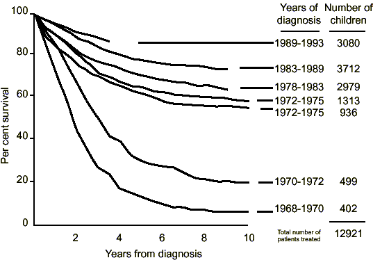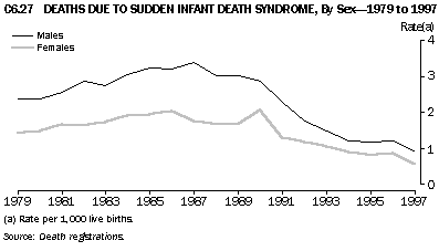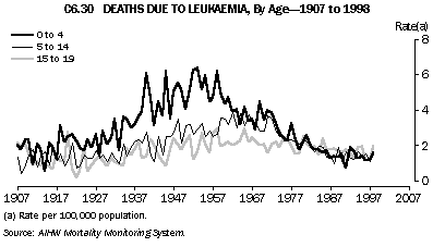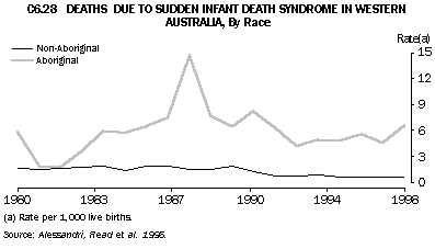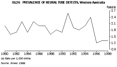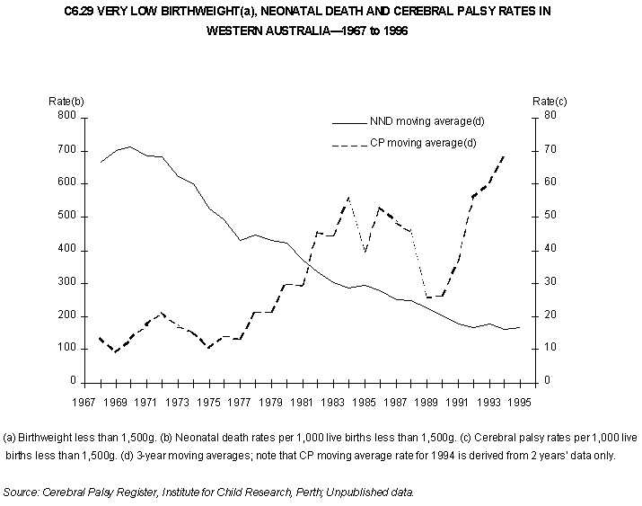 Thus one in five teenage school children will have a mental health problem and most will not seek or receive treatment. The implications for school health services is that this level of morbidity demands a preventive approach, aimed at reaching large numbers of children and adolescents. In addition to the detection and surveillance of disabilities in school children and giving them health education, there is a huge unmet need to provide preventive strategies-both in and out of school. Infancy and early childhood are critical times for the social and physical development of the child, and his/her resiliency and success as an adult. By the age of 4-5 years, when most Australian children are about to start school, the stage for good or bad health and educational outcomes has been set. Research around parenting and its impact on this early period has also highlighted how important it is for that child’s own capacity as a parent. This research must be considered when designing appropriate interventions-the earlier the better if we wish to make real differences to child development and adult competencies. This research also suggests that any activities that undermine parents, or interfere with their capacity to be good and loving parents and to create a nurturing environment for their child, should be avoided at all costs. The policy of removing half-caste Indigenous children from their families was certainly devastating to generations of children and families, and it continues to have effects on today's parents and families (Human Rights and Equal Opportunity Commission 1997). THE ROLE OF HEALTH AND MEDICAL RESEARCH - SOME CASE STUDIES ILLUSTRATING THE ADVANCES IN THE 20th CENTURY The special case of neural tube defects Birth defects (congenital malformations) are now one of the commonest reasons for deaths in early infancy and childhood, for hospitalisations, for other care of and disabilities in children. Little is known about the causes of most malformations, which limits our capacity to prevent them. One of the most common burdensome birth defects results from failure of closure of the developing neural tube in the developing embryo. The resulting defects of anencephaly, spina bifida and encephalocoele, collectively called neural tube defects, cause death or often lifelong disability. Antenatal diagnosis (ultrasound and blood tests) followed by offering termination to mothers of affected fetuses was the only 'preventive' strategy. Research throughout the 1980s, in Australia as well as internationally, elucidated the protective effect of a maternal diet rich in or supplemented by folate, a B vitamin, found commonly in leafy green vegetables (Bower and Stanley 1996). The impact of increasing maternal folate around the time of conception in WA is shown in graph C6.26. The special case of SIDS Sudden infant death syndrome (SIDS) or cot death was not a classifiable ICD cause of death until the 1970s. Graph C6.27 shows the Australian SIDS rates from 1979 to 1997. The rate peaked in the late 1980s in males to above 2.5 per 1,000 live births and was 1.5 for females. Australian research from Tasmania, published in 1989 (Dwyer, Ponsonby et al. 1991) clearly demonstrated the risk of laying babies on their tummies to sleep. Other risks including wrapping the baby up too warmly, smoking and not breastfeeding. A major education campaign to 'Reduce the risks' was run in the early 1990s, which resulted in a dramatic reduction of the rates to around 0.5 per 1,000. The rate of SIDS in Indigenous babies (graph C6.28) was higher than in Caucasian babies and even after the campaign, has remained high (Alessandri, Read et al. 1996). Possibly other causal pathways to SIDS may be more important in these infants. The special case of preterm births and NICU The increasing survival of very preterm infants with more and more expensive neonatal intensive care, but with worrying levels of disability, has been debated and questioned internationally. In the US this has been referred to as the perinatal paradox: “the basic incongruity in American perinatal care lies in our superb ability to care for the individual patient and our dismal failure to address the problems of the larger society” (Rosenblatt 1989). The rates of death in smaller and smaller preterm neonates have fallen since the introduction of neonatal intensive care, and the rates of motor disability such as severe cerebral palsy have risen in the survivors (Stanley, Blair et al. 2000). This is also illustrated in graph C6.29. Meanwhile the proportion of all births born preterm has not changed, suggesting that our efforts have been concentrated on treating the sick preterm newborns rather than on trying to increase the numbers born at term. We must put as much effort into researching the causal pathways to preterm births and other causes of low birth weight as we have into the biomedical research that has had such a wonderful effect on their survival. The special case of childhood leukaemia Cancer as a cause of mortality and morbidity has always been low in children. Mortality increased from 1907 to the 1950s probably reflecting better ascertainment and more children surviving infancy rather than a real increase in incidence. The falls from around the 1950s, to the 1990s are due to more effective therapy. As yet we do not know how to avoid cancers in children. The rates for deaths due to leukaemia are shown in graph C6.30. There are several important points to make about the reasons for the substantial improvements in cancer survival shown in graph C6.31. One is a wonderful lesson of the demonstration of the importance of randomised controlled trials to ascertain better clinical practice. Another is the multidisciplinary teamwork needed for both research to identify better drugs and to implement best practice. Australian children have benefited from participating in these international research groups. C6.31 SURVIVAL OF CHILDREN WITH ACUTE LYMPHOBLASTIC