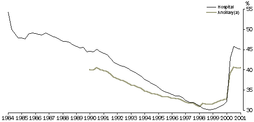 Coverage has remained stable since the September quarter 2000, with the proportion covered by hospital insurance remaining above 45% and the proportion covered by ancillary remaining above 40% for the December 2000 and March 2001 quarters.
