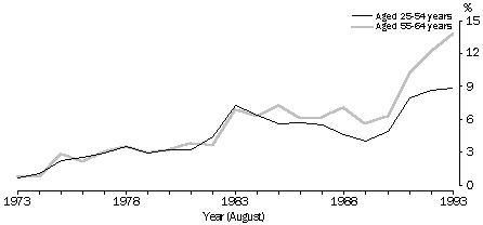 Source: Labour Force Survey; Cass et al (1988)1; Department of Social Security Ten Year Statistical Summary and Characteristics of Pensioners Unemployment and discouragement With rising levels of unemployment over the last 10 years, the question arises as to whether or not early retirement is voluntary. Older men have been particularly affected by changes in labour market conditions since the early 1970s. This is partly because they were concentrated in some of the industries and occupations that have been most affected by structural change. In addition, they have higher levels of disability and ill health than younger men, reduced job mobility, and, often, less current qualifications. These labour market difficulties for older men have led to higher unemployment rates than prime aged men, longer durations of unemployment, and a higher incidence of long-term unemployment (see Long-term unemployment). Since the 1983 recession the unemployment rate of men aged 55-64 years has been consistently higher than that of men aged 25-54 years. Following the economic downturns in 1983 and 1990, there were increases in unemployment rates at all ages. In 1985 the unemployment rate of men aged 55-64 years was nearly 2 percentage points higher than that of men aged 25-54 years. In 1992 the unemployment rate of men aged 55-64 years had risen to over 3 percentage points higher than that of men aged 25-54 years. By August 1993 the unemployment rate of men aged 55-64 years was 5 percentage points higher than that of younger men (14% compared to 9%). The incidence of long-term unemployment increases markedly with age. In 1993 the incidence of long-term unemployment among men aged 55-64 years was 61%, compared to 43% for men aged 25-54 years, suggesting that once older men become unemployed the likelihood of them becoming long-term unemployed is substantial. In 1993 unemployed men aged 55-64 years were almost four times as likely to be long-term unemployed as unemployed men aged 25-54 years. The average duration of unemployment for men aged 55-64 years was about two years compared to about 15 months for men aged 25-54 years. It is difficult to assess precisely how much labour market conditions have actually discouraged labour force participation of older men although the chance of older men becoming discouraged jobseekers is greater than that of prime aged men. Between 1983 and 1993, the ratio of discouraged jobseekers to unemployed among older men was at least four times higher than the ratio among younger men. MALE UNEMPLOYMENT RATE Source: Labour Force Survey MALE DISCOURAGED JOBSEEKERS