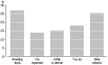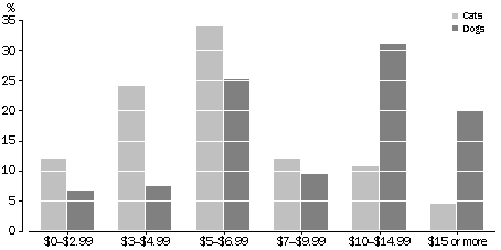 Dogs and cats Dwelling type and available space may influence the type of pet a household keeps. 43% of households living in a separate house owned a dog and 30% owned a cat. Households not living in separate houses were slightly more likely to have owned cats than dogs. Households with only one cat were likely to have obtained it from either friends, relatives, or neighbours (41%), or as strays (20%). 33% of households with only one dog obtained it from friends, relatives, or neighbours and 26% obtained it from a breeder. Households with more than one cat or dog were likely to have obtained their second pet from the litter of an existing or previous pet. There was a higher proportion of pedigree dogs (43%) than pedigree cats (11%). Half of the households who owned a pedigree dog or cat obtained it from a breeder. Nearly half of Australian households did not keep cats or dogs. The most common reasons given for not keeping cats or dogs was that they were too much bother (22% of households), the terms of their lease (17%), dogs and cats restricted other activities (15%) and because their cat or dog had died (15%). 82% of households had previously owned a cat or dog. 74% of households who did not currently have pets had previously kept a cat or dog. 12% of households with cats or dogs had never kept them before. REASONS DOGS HAVE NOT BEEN NEUTERED, 1994 Source: Population Survey Monitor Responsibilities of owning a pet The responsibility of owning a pet can be large in financial terms as well as in time expended on their care. One of the largest initial outlays is having a pet immunised and neutered. In 1994, three-quarters of the domestic cats in Australia had been neutered, compared to just over half of the dogs. The Australian Capital Territory had the highest proportions of neutered cats and dogs, and Tasmania had the lowest. The most common reason why cats had not been neutered was the expense (46%). For dogs, the most common reason was that they were used for breeding (27%). Unless cats are neutered they have great potential for rapid increase in population numbers. Cats can have three litters a year, with an average of five kittens per litter1. The rapid reproduction of cats in urban areas contributes to the large numbers of stray cats that are put down by animal welfare agencies each year. Another large cost involved in owning a pet is feeding. Australians spent $36.3 million per week on feeding and caring for their cats and dogs in 1994. Households with only cats spent on average $6 per week to feed and care for each cat, compared to $10 per week spent on each dog by households with only dogs. 85% of cats were fed mainly commercial pet food, compared to 70% of dogs. Of the cats and dogs fed specially prepared fresh food, 22% of the cats and 57% of the dogs were pedigree. Australian households also spent 2.5 million hours caring for, grooming and exercising their cats and dogs. Households who kept only cats spent on average 38 minutes per day caring for, grooming and exercising pedigree cats and 25 minutes per day on non-pedigree cats. Dogs take more time to care for and, in particular, to exercise. Households with only dogs spent on average 50 minutes per day caring for, grooming and exercising their dog. An important responsibility for pet owners is controlling their cat's or dog's behaviour, especially when children are around. Children under four years old are at higher risk of being bitten by a dog or cat than older children. This possibly reflects the fact that younger children are more likely than older children to be at home with the family pet. A recent study by the National Injury Surveillance Unit2 indicated that children aged 2-4 years were the highest risk group, with dog and cat bite injuries amounting to 2% of all injuries. Less than 1% of all injuries to children under 1 year old were by cats and dogs, with dogs responsible for 87% of them. Most of the injuries occurred at home, bites were the most common injury and the head was the most frequently injured part of the body. The Victorian Injury Surveillance System reported in 19923 that a quarter of dog bite injury cases occurred in public areas. WEEKLY HOUSEHOLD EXPENDITURE ON CATS AND DOGS, 1994 Source: Population Survey Monitor Environmental concerns The Australian Nature Conservation Agency estimates that the average domestic cat kills about 25 native animals a year. This implies about 75 million native animals are destroyed by domestic cats each year1. One way to stop cats from hunting is to stop them from roaming. In 1994, only 26% of domestic cats were confined both during the day and night, compared to 88% of dogs. Cat curfews are now being considered as a means of reducing the number of native animals killed. The Shire of Sherbrooke in Victoria was the first shire in Australia to have introduced a local law to control cats1. The Cat and Dog Management Act 1994 was proclaimed as South Australian law in March 1995. Stray cats and dogs can be a considerable nuisance to householders and a potential source of disease to their own pets. 36% of households said that stray dogs and/or cats were a problem on their property. South Australia had the largest proportion of households with stray cat problems (32%), followed closely by the Australian Capital Territory, Western Australia and Victoria (each 31%). The Australian Capital Territory (24%) and Tasmania (23%) had the largest proportion of households with stray dog problems. The scale of the problem of stray and dumped animals is well known to the RSPCA. Their shelters received 104,192 animals in 1993-94, 10% less than in the previous financial year. These animals included 43,762 dogs and 42,126 cats. 19% of the dogs were reclaimed and 50% were put down. In contrast, 3% of cats were reclaimed and 74% were put down. In 1993-94 there were about 20% fewer dogs and cats received than in 1992-93. There were a further 18,304 other animals surrendered which included possum