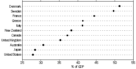 International comparison Tax structures and levels of taxation vary considerably throughout the world. In relation to other OECD countries Australia has a relatively low overall level of taxation. In 1995, Australia ranked 24th among the 29 OECD countries, with taxation revenue equal to 31% of GDP. In terms of the relative contribution of personal income tax to total taxation revenue, Australia (41%) ranked third behind Denmark (54%) and New Zealand (44%). Australia, unlike the majority of OECD countries, does not have specific social security contributions as part of its tax structure. Consequently, when employee contributions to social security were added to personal income tax, Australia ranked only ninth for contribution of total personal taxes to total taxation revenue. In terms of the contribution of corporate income tax to total taxation revenue, Australia (15%) ranked third behind Luxembourg (18%) and Japan (15%). However, when payroll taxes and employer contributions to social security were added to corporate income tax, Australia ranked seventeenth for contribution of total corporate taxes to total taxation revenue. The importance of goods and services taxes varied considerably among OECD countries, contributing less than 20% of total taxation revenue in some countries such as Japan and the United States and over 40% in others such as Korea, Greece, and Portugal. Australia ranked seventeenth, with goods and services taxes contributing 29% of total taxation revenue. COMPOSITION OF TAXATION REVENUE FOR SELECTED OECD COUNTRIES, 1995(a)