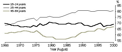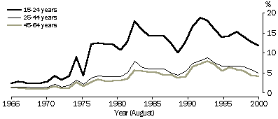 Unemployment rates 1966-2000 Between 1966 and 2000, both the number of people who were unemployed and Australia's unemployment rate have increased. Over this period, the number of unemployed people in Australia increased from 90,300 to 596,000. In the late 1960s and early 1970s, the unemployment rate stood at 2% but over the 1970s rose gradually to 6%. The early 1980s saw a sharp rise in the unemployment rate to 10% in 1983. This declined to 6% by 1989. A further steep rise then occurred in the early 1990s, peaking at 11% in 1993. As well as showing a general increase over the period, the unemployment rate has fluctuated with the economic cycle. However, unemployment rates have become successively higher with each economic downturn (1972, 1978, 1983 and 1993). Although following a similar pattern, the unemployment rate for women until 1991 was consistently higher than that for men. Since 1991, this pattern has reversed with the unemployment rate for men remaining higher than for women, although the difference between these rates has varied over the time period. This reversal is likely to be a result of, first, decreases in the availability of full-time work (especially in manufacturing industries and in agriculture) during the 1990s which has had greater impact on men, who tend to look for full-time work. Second, the growth in part-time and casual work during the 1980s has also been a contributing factor, since it provided greater employment opportunities for women, many of whom seek part-time work.1 UNEMPLOYMENT RATES(a) (a) Seasonally adjusted. Source: Labour Force, Australia, 1966-2000 (ABS cat. no. 6203.0 and 6204.0). Young people The early employment experiences of individuals impact on their future employment prospects. Consequently, the early working years of young people (those aged 15-24 years) are an important time for gaining and developing skills, establishing a career and obtaining economic independence. For many young people, when periods of unemployment form part of early labour force experience, finding stable employment and establishing a career can be difficult. However, not all young people in the labour force are seeking full-time work or establishing a long-term career. Many are participating in full-time education (some still at school), and some are living with their parents. For the period 1966-2000, the labour force participation rate of young people remained around 70%. However, since the late 1970s, the unemployment rate for young people has been notably higher than that for other age groups. Over the same period (1966-2000), unemployment among the older age groups has risen and increasingly, young job seekers have had to compete for jobs against people with more work experience. This is an issue of particular concern for young people looking for their first full-time job (see Australian Social Trends 1998, Young jobseekers). While unemployment rates of 15-24 year olds differed from those of older people, there was also variation within this age group. As new entrants to the labour force, 15-19 year olds are less likely to have previous work experience than 20-24 year olds and consequently are less competitive in the job market. This was reflected in the consistently higher unemployment rate for people aged 15-19 years than for those aged 20-24 years (15% compared with 9% in August 2000). Many 15-19 year olds are still at school and are therefore less likely to have joined the labour force than 20-24 year olds. In August 2000, the labour force participation rate for 15-19 year olds was 57% compared with 81% for 20-24 year olds. Thus, the numbers of unemployed people in each age group were quite similar (116,100 and 103,800 respectively). LABOUR FORCE PARTICIPATION RATE BY AGE Source: ABS Labour Force Survey, 1966-1977; Labour Force, Australia, 1978-2000 (ABS cat. no. 6203.0 and 6204.0). UNEMPLOYMENT RATE(a) BY AGE (a) Original series. Source: ABS Labour Force Survey, 1966-1977; Labour Force, Australia, 1978-2000 (ABS cat. no. 6203.0 and 6204.0). 25-44 year olds Most people's primary working years are between the ages of 25 and 44 years. Reflecting this, throughout the period 1966-2000, labour force participation rates among this age group were generally higher than rates for other age groups. In addition, their labour force participation rates have been steadily increasing, largely due to marked increases in the participation of women in the labour force, especially in part-time work (see Australian Social Trends 1998, Trends in women's employment). Between 1966 and 2000, levels of unemployment for 25-44 year olds, as for all age groups, followed the series of peaks and troughs associated with the economic cycle. Similar unemployment rates existed for men and women, but the numbers of unemployed women were much lower than the numbers of unemployed men. This reflects women's lower labour force participation, as many women in this age group are caring for children. People aged 25-44 years are likely to be partnered and/or raising children. Since employment is the main source of income for most families, unemployment among parents and partners impacts on the economic and social wellbeing of both individuals and other family members. However, the unemployment of a parent often has a greater impact on the economic wellbeing of one-parent families compared with couple families. In couple families, there are two parents to share work and family responsibilities. That is, if one parent is not working, the other is usually able to provide the main source of income. For one-parent families, there is only one adult who can provide income for the family through labour force participation. In August 2000, around 6% of both couple and one-parent families had at least one parent unemployed. However, for more than half of the couple families, while one parent was unemployed, the other was employed. UNEMPLOYMENT RATES(a) AND NUMBER UNEMPLOYED