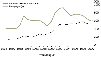 Part-time workers wanting more work During times of high unemployment, limited job opportunities and greater competition for available full-time work increase the number of people who work part-time while continuing to seek longer working hours. The majority of people working part-time do so by choice. Those part-time workers who indicate they would like to work more hours are often referred to as underemployed workers (see Australian Social Trends 1999, Men and women wanting work). Over the period 1978-2000 (1978 being the first year data became available on part-time workers wanting more work), fluctuations in the number of part-time workers who preferred to work more hours mirrored those for the number of unemployed people. In 1978, of all part-time workers, 124,000 (13%) people preferred to work more hours. This rose to 575,000 (26%) in 1998 but had fallen slightly to 546,000 (23%) by August 2000. The majority of underemployed workers were women (60%), and 33% were under 25 years of age, reflecting the greater proportions of workers in these groups who work part-time. UNEMPLOYED PEOPLE AND PART-TIME WORKERS WHO PREFER TO WORK MORE HOURS (a) Seasonally adjusted Source: Labour Force, Australia, 1978-2000 (ABS cat. no. 6203.0 and 6204.0). Endnotes 1 Borland, J. and Kennedy, S. 1998, Dimensions, Structure and History of Australian Unemployment, Discussion paper no. 388, Centre for Economic Policy Research, Australian National University, Canberra. 2 Borland, J. 1998, Rural Labour Markets in Australia, Discussion paper no. 383, Centre for Economic Policy Research, Australian National University, Canberra, pp. 1-2. 3 International Labour Organisation 1999, Key Indicators of the Labour Market 1999, International Labour Office, Geneva.