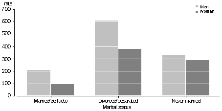 Levels and trends The last National Crime and Safety Survey conducted in 1993 found that 2.5% of all persons aged 15 years and over had experienced an assault in the 12 months prior to the survey. This was lower than the rate (3.4%) recorded in 1983. This decrease cannot be taken at face value, however, as changes in survey methods may have accounted for some of the change. Annual crime victims surveys conducted in New South Wales between 1990 and 1996 show that assault rates have fluctuated between 2.1% and 2.8% over the period. Assault rates recorded in 1996 were, nevertheless, higher than those recorded at the beginning of the decade. ASSAULT RATES BY AGE, 1993 Source: National Crime and Safety Survey (unpublished data). Groups at risk Of all assault victims identified in the 1993 survey, almost two thirds (64%) were men and almost seven in ten (69%) were aged between 15 and 34. Only a small proportion of victims (4%) were aged 55 and over. Youths aged 15-19 were the group most at risk. 8% of men and 4% of women in this age group had experienced an assault in the previous 12 months. The likelihood of being a victim decreased with age and, across all age groups, was lower for women than men. Nevertheless, the likelihood of women aged 15-19 being assaulted was higher than for men aged 25-34. Just as there were large differences in assault rates among people in different age groups, there were also differences between individuals depending on their marital status and their labour force status. Married and employed people were less likely to be victims of assault than those who had never married or those who were unemployed. Even after standardising for age effects, major differences between marital status groups and labour force status groups are apparent. Among people aged 20 years and over, married men and women had the lowest age-standardised assault rates of all marital status groups. However, it should be noted that incidents of domestic violence may have been under-reported in the survey because the questionnaire (a mail-back, self- completion form) could not necessarily be answered without the offender being aware of the responses. In comparison, separated and divorced people of either sex were more vulnerable to assault than their married or never married counterparts. Violent disputes between ex-partners following separation may account for the high rates among separated and divorced people3. However, other lifestyle factors are likely to be important in explaining why separated and divorced men had the highest rates of assault. Unemployed people of either sex were more likely to be victims of assault than either employed people or those not in the labour force. The age-standardised rate for unemployed males was 26% higher than those for men not in the labour force and 61% higher than those for men with work. The age-standardised rate for unemployed women was 58% higher than those for employed women, but there was little difference between women with jobs and those who were not in the labour force. AGE-STANDARDISED DEATH RATES(a) BY MARITAL STATUS(b), 1993 (a) Rate per 10,000 of the population. (b) Refers to people aged 20 years and over.