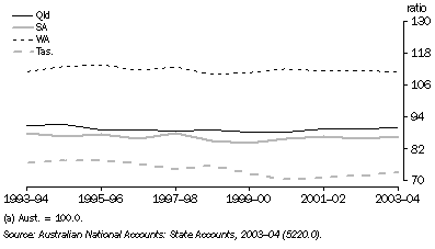 An important use of state accounts is to compare the performance of each state and territory. Graph 29.20 shows the ratio of GSP, in current prices, per person for each state and territory to the Australian value (GDP per person) since 1993--94. For New South Wales, Victoria, Western Australia, Northern Territory and Australian Capital Territory, GSP per person has been above the national average. For Queensland, South Australia and Tasmania, GSP per person has been below the national average.