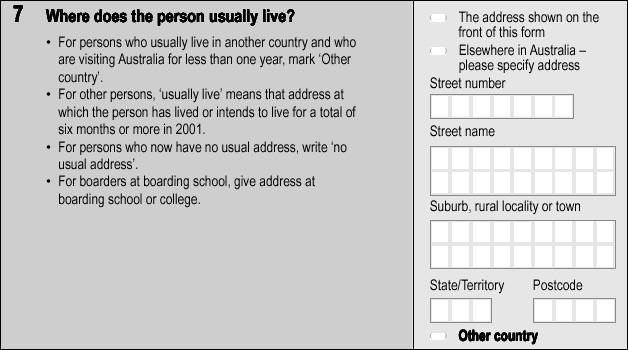 This variable contains the tick box answer to Question 7 on the Census form which asks for a person’s usual residence on Census Night. In cases where a person did not state where they usually live, the Usual Address Indicator Census Night is imputed.