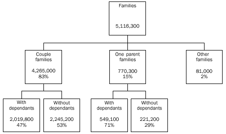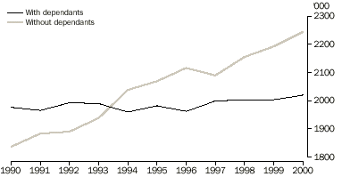 Note: The Labour Force Survey product set is changing in 2003. AUSTRALIAN FAMILIES COUPLE FAMILIES In June 2000, 77% of couple families had at least one partner employed. This proportion has risen from 75% in June 1993. The proportion in June 1990 was 78%. The proportion of couple families with both partners employed has risen from 49% in June 1990 to 51% in June 2000. The percentage of couple families where one partner was employed and the other was not in the labour force has decreased from 27% in June 1990 to 23% in June 2000. COUPLE FAMILIES: EMPLOYMENT STATUS OF PARTNER/S AND WHETHER DEPENDANTS PRESENT COUPLE FAMILIES WITH DEPENDANTS PRESENT The proportion of couple families with dependants present in which one or both partners were employed was 93% in June 2000, the same as June 1990. The husband was employed in 89% of all couple families with dependants. This proportion has been steady in recent years. In 95% of these cases, the husband was employed full time. The wife was employed in 61% of couple families with dependants. The proportion where the wife was employed full time has risen from 20% in the early 1980s to 26% in June 2000. The percentage of wives employed part time was 35% in June 2000. This percentage has been relatively steady at around 34% between June 1995 and June 1999, after rising slowly from around 25% in the early 1980’s. The proportion of wives in full-time employment rose as the age of the youngest dependant increased, as shown in the following graph. COUPLE FAMILIES: FULL-TIME EMPLOYMENT STATUS OF PARENT BY AGE OF YOUNGEST DEPENDANT In 2.9% of couple families with dependants present (57,900 families) the husband was unemployed and the wife was either unemployed or not in the labour force. In 41% of these families, the husband had been unemployed for 52 weeks or more. This proportion has fallen from 45% in June 1999. The percentage of couple families with dependants present with one or both parents unemployed was 6.5% in June 2000. This proportion is unchanged from June 1999, but has fallen 1.2 percentage points since June 1998. The proportion of these families with one or both partners unemployed generally reflects changes in the overall level of unemployment. The number of children aged 0-14 in couple families where neither parent was employed was 265,700 in June 2000. COUPLE FAMILIES WITHOUT DEPENDANTS PRESENT In June 2000, 53% of couple families had no dependants present. The proportion has been consistently greater than 50% since June 1994. COUPLE FAMILIES The husband and wife were both aged 45 years or over in 72% of couple families without dependants present in June 2000, a decrease from 73% in 1999. Of these, 49% were families where both partners were not in the labour force. At least one partner was employed in 63% of couple families without dependants present and 44% had both partners employed. The husband was employed full time in 51% of couple families without dependants and the wife was employed full time in 32%. In these families, the proportion in which wives were employed part time has risen from 14% in June 1993 to 17% in June 2000, although it has remained steady over the last 2 years. Over time, the proportion where at least one partner was unemployed broadly reflects movements in the overall level of unemployment. In June 2000, this proportion was 3.3% for these families (compared with 6.5% for couple families with dependants present). ONE PARENT FAMILIES In June 2000, there were 770,300 one parent families, making up 15% of all families. This proportion has increased from 13% in June 1994. ONE PARENT FAMILIES: EMPLOYMENT STATUS OF PARENT BY AGE OF YOUNGEST DEPENDANT The percentage of one parent families where the parent was not in the labour force decreased to 46% in June 2000 from 51% in June 1994. The parent was unemployed in 6.3% (48,500) of one parent families. In 13,900 or 29% of these families, the parent had been unemployed for 52 weeks or more. ONE PARENT FAMILIES WITH DEPENDANTS PRESENT In June 2000, there were 549,100 one parent families with dependants present, 71% of all one parent families. Of these, 86% had a female parent. In 58% of one parent families with dependants the youngest child was aged 0-9 years. The parent was employed in 51% of one parent families with dependants present in June 2000, an increase from 46% in June 1998. Male parents were employed in 64% of these families, compared with 49% of those with a female parent. The proportion with the parent employed generally increased as the age of the youngest dependant increased, with 70% of one parent families whose youngest dependant was aged 15-24 years having an employed parent, compared to 30% whose youngest dependant was aged 0-4. The percentage of one parent families with dependants present where the parent was unemployed has decreased to 7.5% in June 2000. The proportion peaked at 9.5% in June 1993 before falling to 8.6% and remained relatively steady for the next three years. It rose to 9.4% in June 1998 before falling again. ONE PARENT FAMILIES WITH DEPENDANTS: PARENT UNEMPLOYED The number of children aged 0-14 in one parent families where the parent was not employed fell by 9% over the last year, to 411,100 in June 2000. The level, however, remains 17% higher than in June 1993. PERSONS WHO WERE NOT MEMBERS OF A FAMILY Persons living alone accounted for 12% (1,672,200) of the population where relationship in household was determined in June 2000. Some characteristics of these persons were: