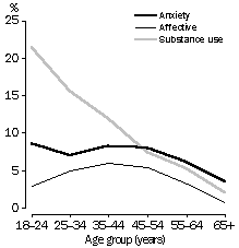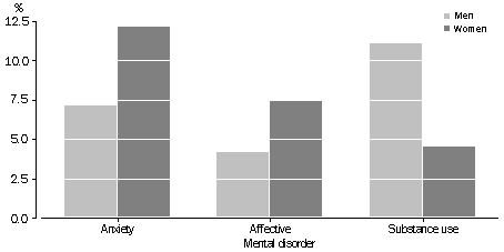 Types of mental health disorders The prevalence of mental disorder was similar for men and women (17% and 18% respectively). However, there were differences in the prevalence of mental disorders of different types among men and women and at different ages. Women were more likely to have experienced anxiety disorders (12% for women compared to 7% for men) and affective disorders (7% compared to 4%). On the other hand, men were more than twice as likely as women to have had a substance use disorder (11% compared to 4%). The prevalence of anxiety disorders for women aged 18-44 ranged between 12% to 15%. Women aged 45-54 had the highest rate of anxiety disorders, 16%, which steadily declined in older age groups to 5% for those aged over 64. For men, the prevalence of anxiety disorders varied little with age until age 55, after which it declined. The prevalence of affective disorders was highest at 11% for women aged 18-24, more than three times the rate for men of this age. For women, the prevalence of affective disorders generally declined with age, while for men, rates increased in the middle years before declining after age 55. Men aged 18-24 had the highest rate of substance use disorders, particularly from excessive alcohol intake, with more than one in five being affected (22%). The equivalent rate for women in this age group was half this (11%). For men and women, the prevalence of substance use disorders declined steadily with age. Alcohol use disorders were about three times more common than any other substance use disorder (7% compared to 2%). The presence of a mental disorder may predispose individuals to other disorders. For example, people who experience social phobia may also experience depression and alcohol dependence. People with an affective disorder were the most likely to have more than one mental disorder. Of those with an affective disorder, 61% also had an anxiety or substance use disorder. In comparison, 43% of those with an anxiety disorder also had an affective or substance use disorder and 31% of those with a substance use disorder had an affective or anxiety disorder. PREVALENCE OF MENTAL DISORDERS(a), 1997